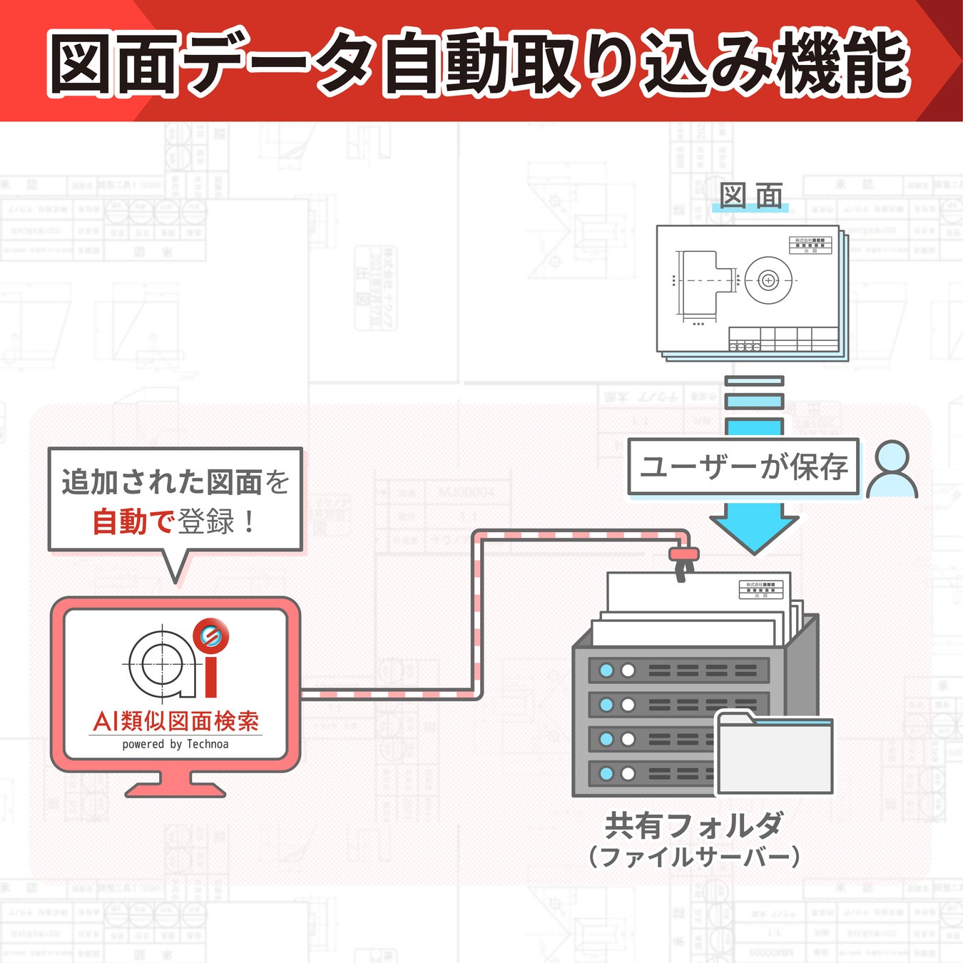 図面管理に使われている共有フォルダ(ファイルサーバー)に保存される新たな図面を、自動でAIが解析し『AI類似図面検索』のデータベースに取り込みます。本機能の追加により、既存のファイルサーバー上に保存されていた図面も、自動取り込み可能となるため『AI類似図面検索』導入時の作業負担が軽減されます。