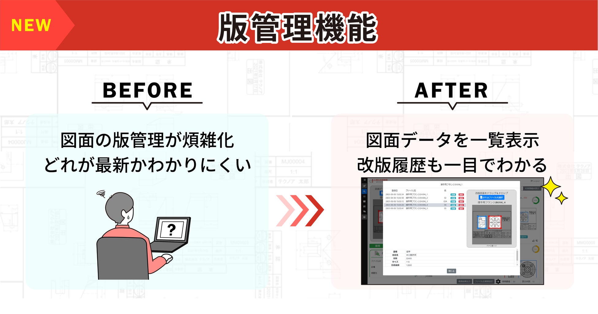 中小製造業様が抱える課題の一つが図面管理の煩雑さです。特に、頻繁に行われる図面改版に関わる情報管理や変更箇所の確認作業が多くの中小製造業様で負担となっています。今回のバージョンアップでは、その課題解決に繫がる機能を追加し、中小製造業様の図面管理の効率化に貢献します。