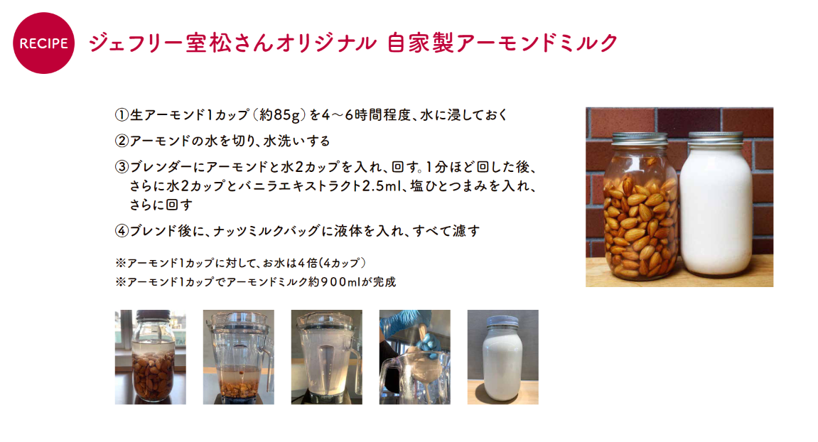ジェフリーさん:私はアーモンドミルクとアーモンドバターを自家製で作っています。今日は自家製アーモンドミルクの調理デモを披露しようと思います。ミキサーさえあれば、誰でも簡単に自宅で作れますよ。作り方は大変だと思われるかもしれませんが、シンプルです。材料はアーモンドとお水、塩、お好みでバニラエキストラクトです。大事なことは、アーモンドをお水に一晩浸すことが大事です。理由としては、お水でアーモンドを柔らかくすること、そして熟成させてクリーミーな味を出すためです。アーモンド1カップ分(約85g) で大体アーモンドミルクは900mLほどが作れますよ。お水の量は、アーモンドの4倍と覚えておいてくださいね。