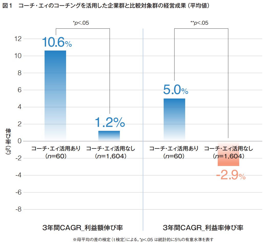 レポートでは、コーチ・エィのクライアント企業のうち、東証1部上場企業及び上場子会社で、2017年〜2019年の3年間にわたって社長や会長など経営トップがコーチングを受けていた企業60社とそれ以外の1,604社の3年間における 経常利益額の年平均成長率(CAGR Profit)および 経常利益率の年平均成長率(CAGR Profit Rate)を比較。図1の通り、コーチ・エィのエグゼクティブ・コーチングを活用していた企業の経営成果が高いことがうかがわれます。