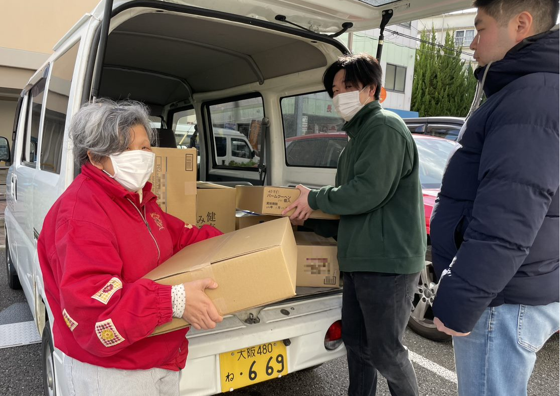 本プロジェクトの趣旨に賛同いただいた株式会社ローソンよりレトルト食品・お菓子を、東大阪市の畑製菓株式 会社よりバームクーヘンを、その他、東大阪市内の有志の方々より野菜や食品をご提供いただき、大阪府東大阪市内にある就労継続支援B型事業所「若草工房」(運営:社会福祉法人若草会)と生活介護事業所「蓮」「蓮Ⅱ」(運営:社会福祉法人草の根共生会)に通う方々のご協力による配送で、同市内の子ども食堂等13拠点に食品寄贈しました。