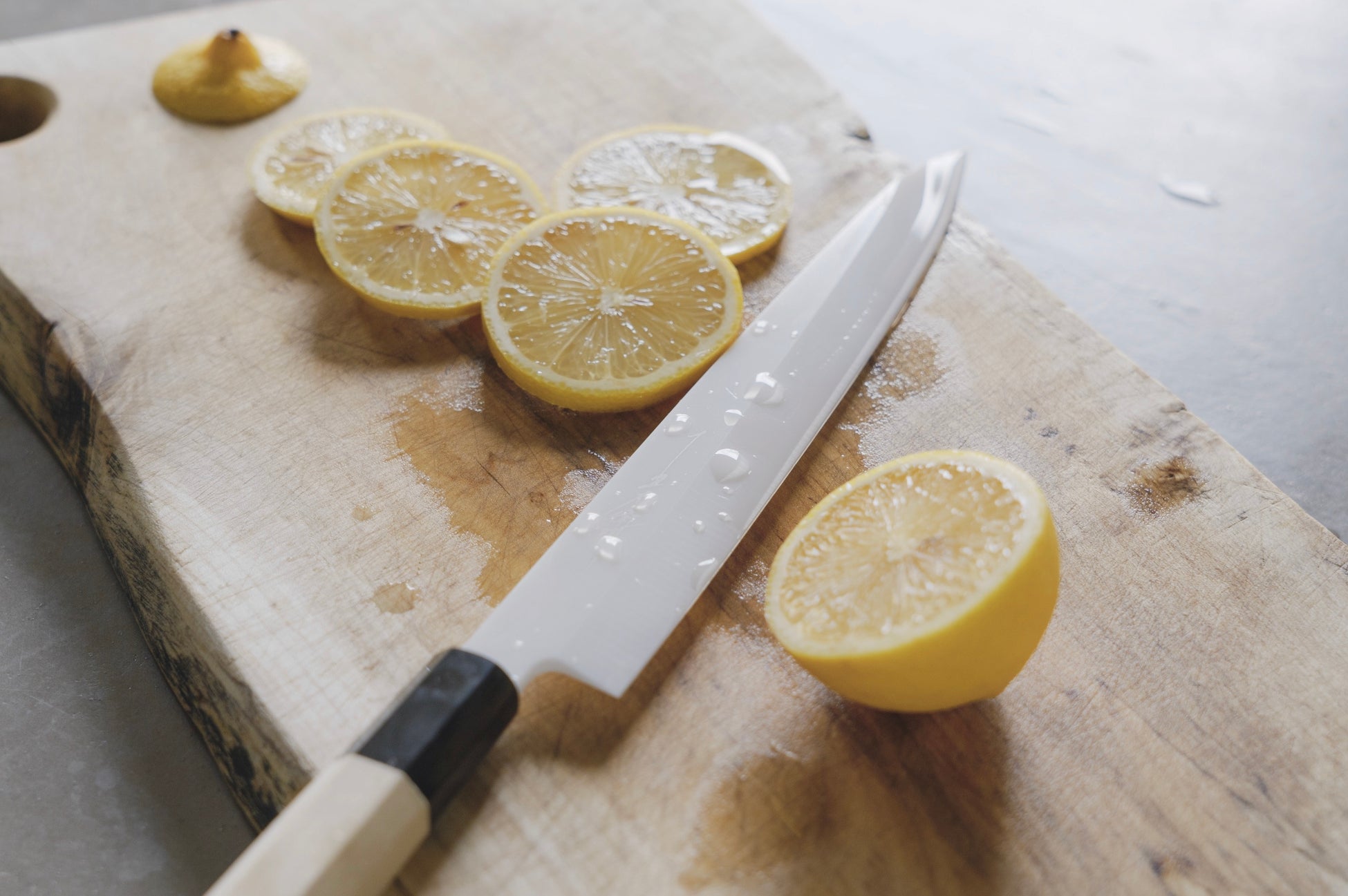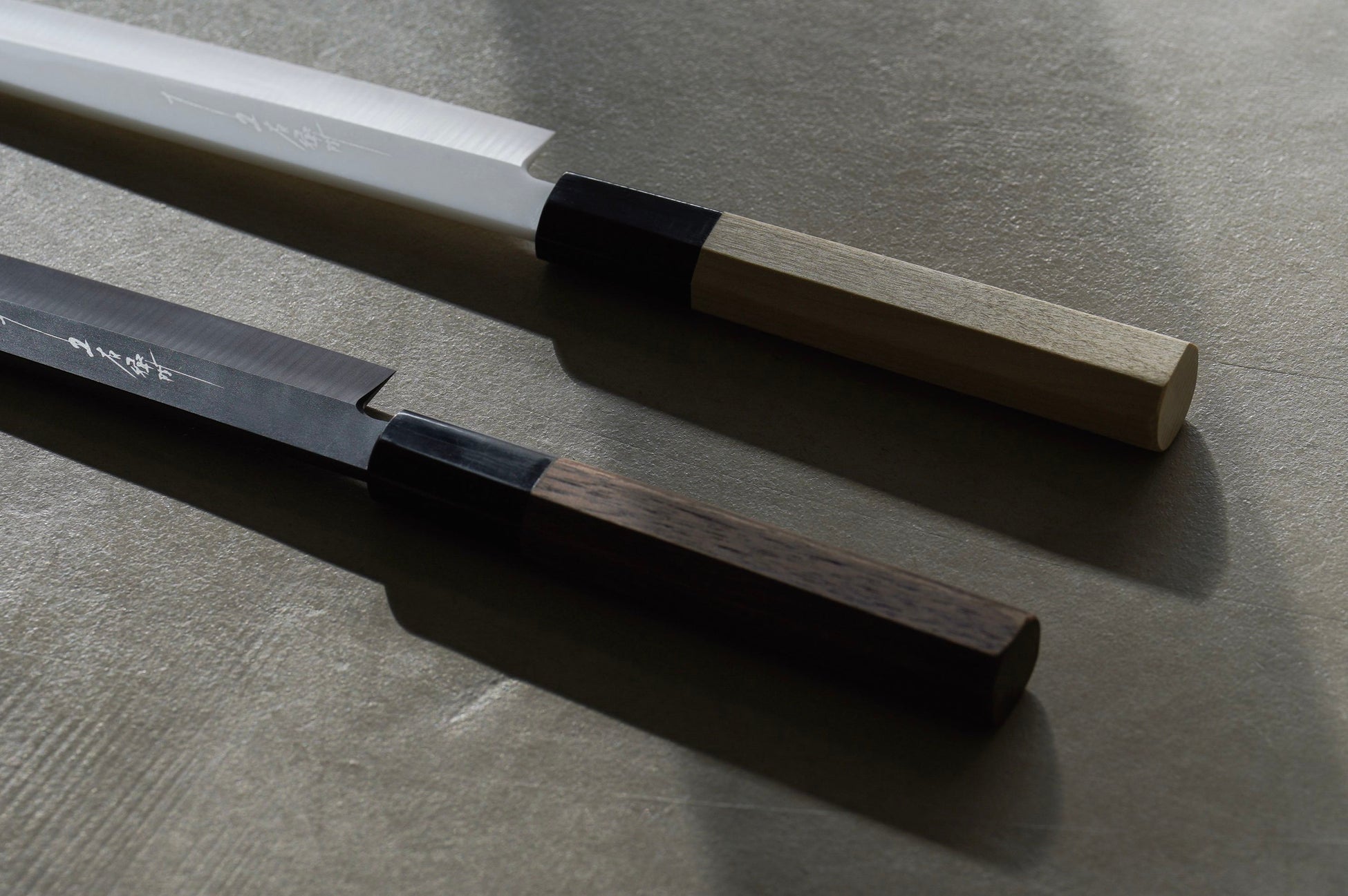 「matou -磨刀-」では、七寸柳(215mm)のサイズを採用。日本の一般的なキッチンで扱いやすいサイズ感を考慮 して設計。市販の包丁スタンドにも収まる長さであるため、 刺身包丁を初めてご購入する方にも保存場所に困らないサイズ感。柄には伝統的な「水牛柄」を採用。口輪に水牛の角、持ち手には木材が使用されている木柄のこと。水牛の角と木材が近しい柔らかさであるため、長年使っていても その境目に段差が付きにくいという利点がある。使っていくうちに自分の握り心地に合わせて経年変化していく。
