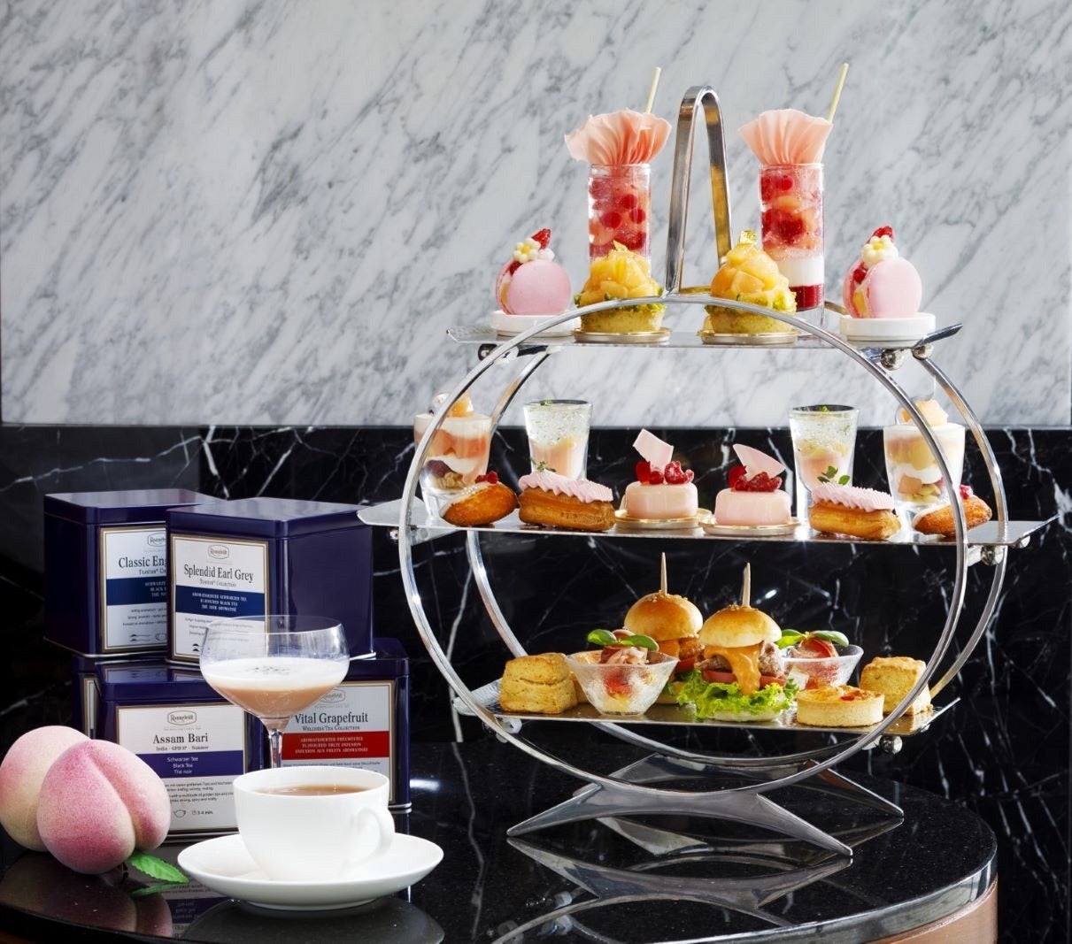 フレッシュな桃をサマーシーズンにぴったりのスイーツ&セイボリーと自家製スコーンなどの品々でお楽しみください。