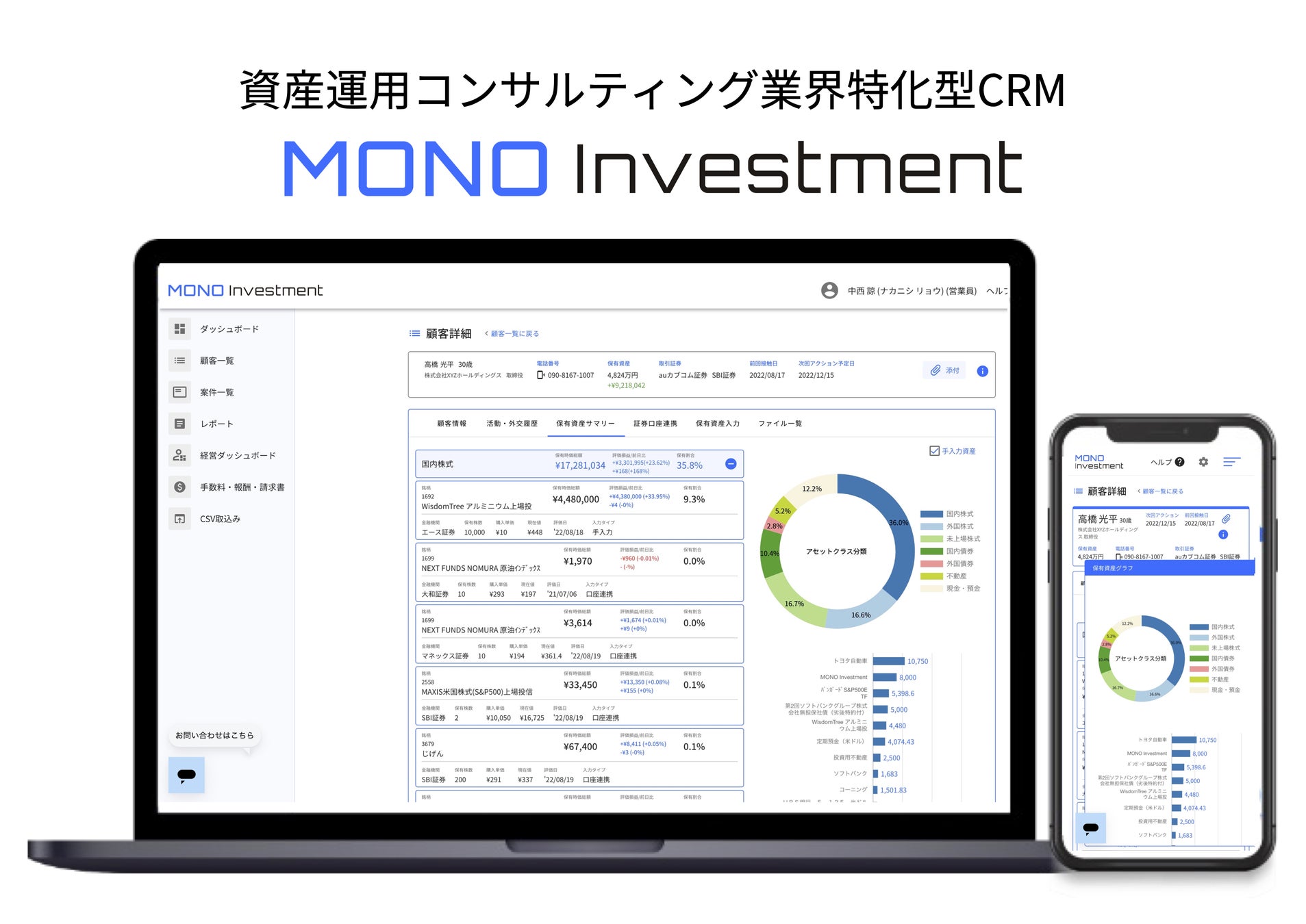 MONO Investmentは、資産運用コンサルティング領域に特化したCRMツール「MONO Investment」を主に提供するフィンテック事業者です。本ツール上で、アカウントアグリゲーション機能や顧客情報管理機能、案件管理機能などを提供することで、顧客提案から管理業務まで、資産運用コンサルティング事業者のあらゆる業務の効率化・高度化を実現しております。