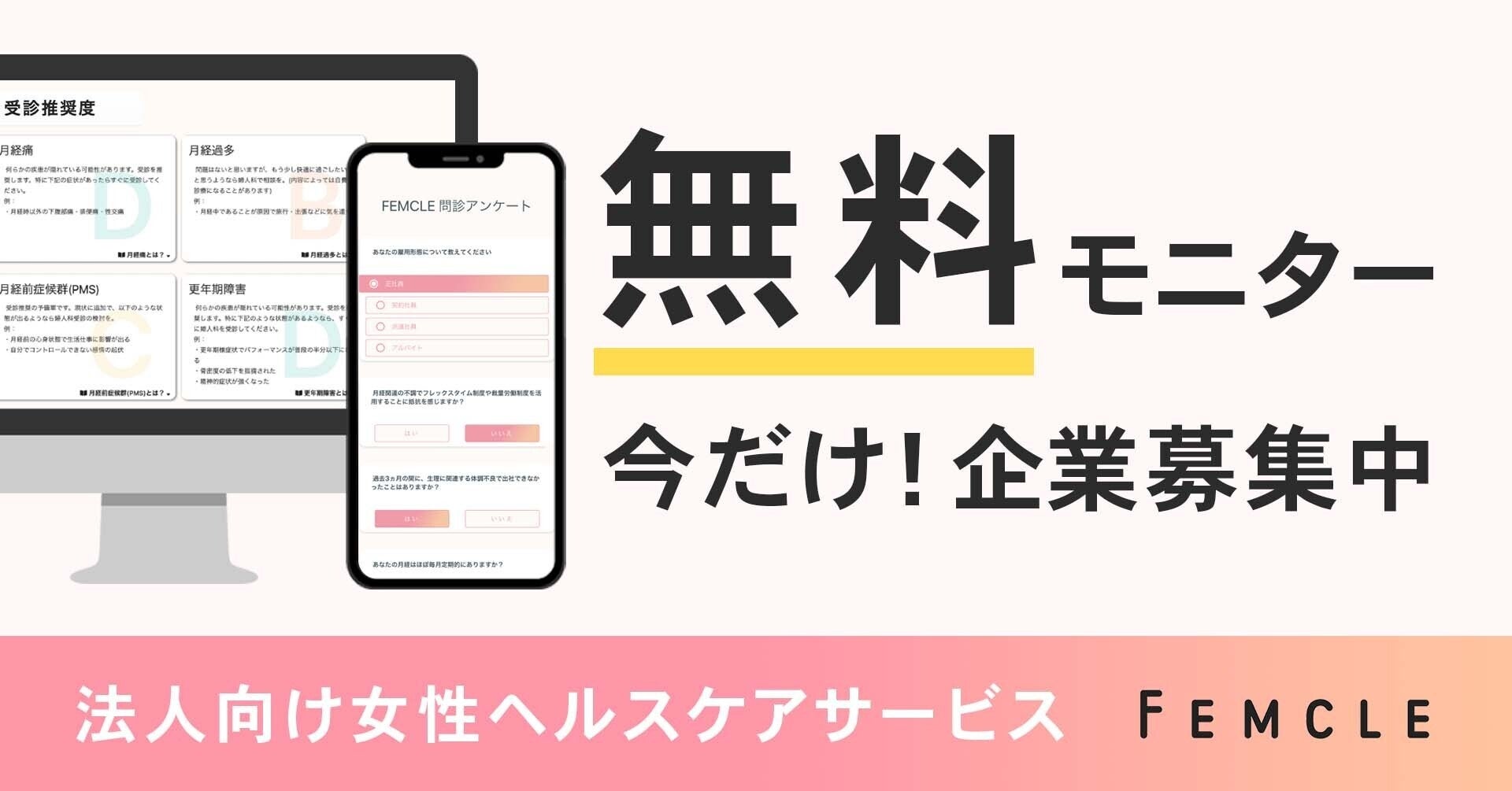 予防医療テックで職域向けにオンライン診療など健康支援プログラムを提供する株式会社リンケージ(本社:東京都中央区、代表取締役社長:生駒恭明)は、働く女性の健康支援サービス「FEMCLE(フェムクル)」に対するフィードバックと、女性の健康課題に対するアプローチの必要性に関する啓発を目的にした、数社限定の無料モニター企業の募集を開始しました。