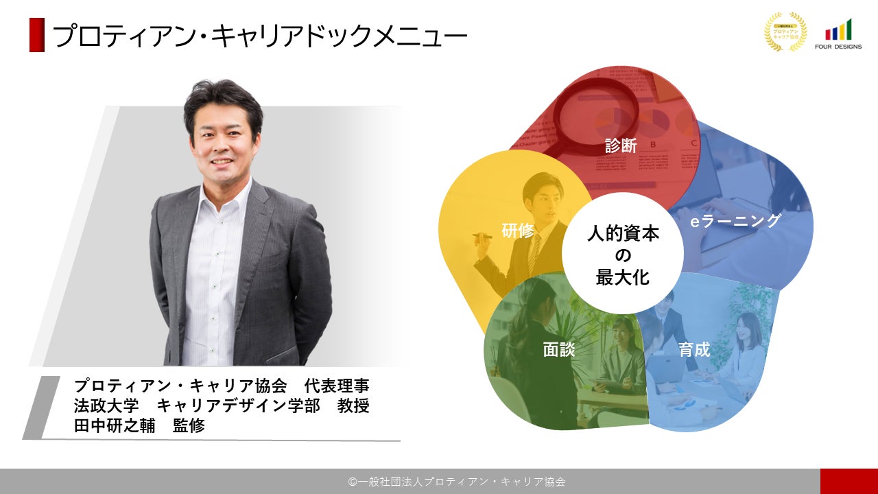 1976年に提唱されたプロティアン・キャリア理論を現代的に解釈し、法政大学・キャリアデザイン学部教授の田中研之輔氏が提唱した『現代版プロティアン・キャリア』に基づいたサービスです。 キャリア形成における『ビジネス資本』『社会関係資本』『経済資本』という3つの要素に着目し、eラーニングや研修、面談など、多様なコンテンツを提供。心理学的側面だけでなく、キャリア理論に基づいた科学的なアプローチを取り入れることで、単なる研修満足度にとどまらず、受講者の行動変容を促します。 一人ひとりのキャリアと向き合い、対話することで、社員のエンゲージメントを高め、組織全体の人的資本向上に貢献します。(4designs㈱を通じて展開)