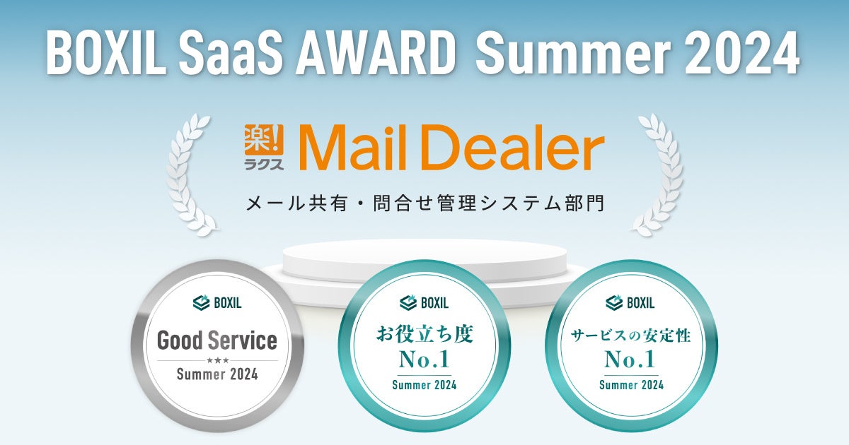 ラクスが提供する「メールディーラー」が、「BOXIL SaaS AWARD Summer 2024」メール共有・問合せ管理システム部門で「Good Service」ほか2つのNo.1に選出