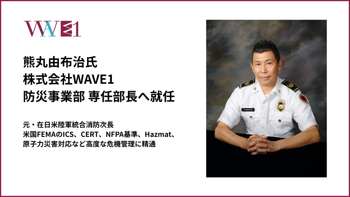 株式会社WAVE1(東京都杉並区、代表取締役社長:吉村拓也、以下「WAVE1」)は、元・在日米陸軍統合消防次長であり、米国FEMA(連邦緊急事態管理庁)のICS(災害時の指揮命令系統を統一する仕組み)、CERT(住民主体の災害初動対応制度)、NFPA基準(米国防火基準体系)、Hazmat(危険物災害対応)、原子力災害対応など高度な危機管理に精通する熊丸由布治(くままる・ゆうじ)氏が、防災事業部専任部長に就任したことをお知らせいたします。