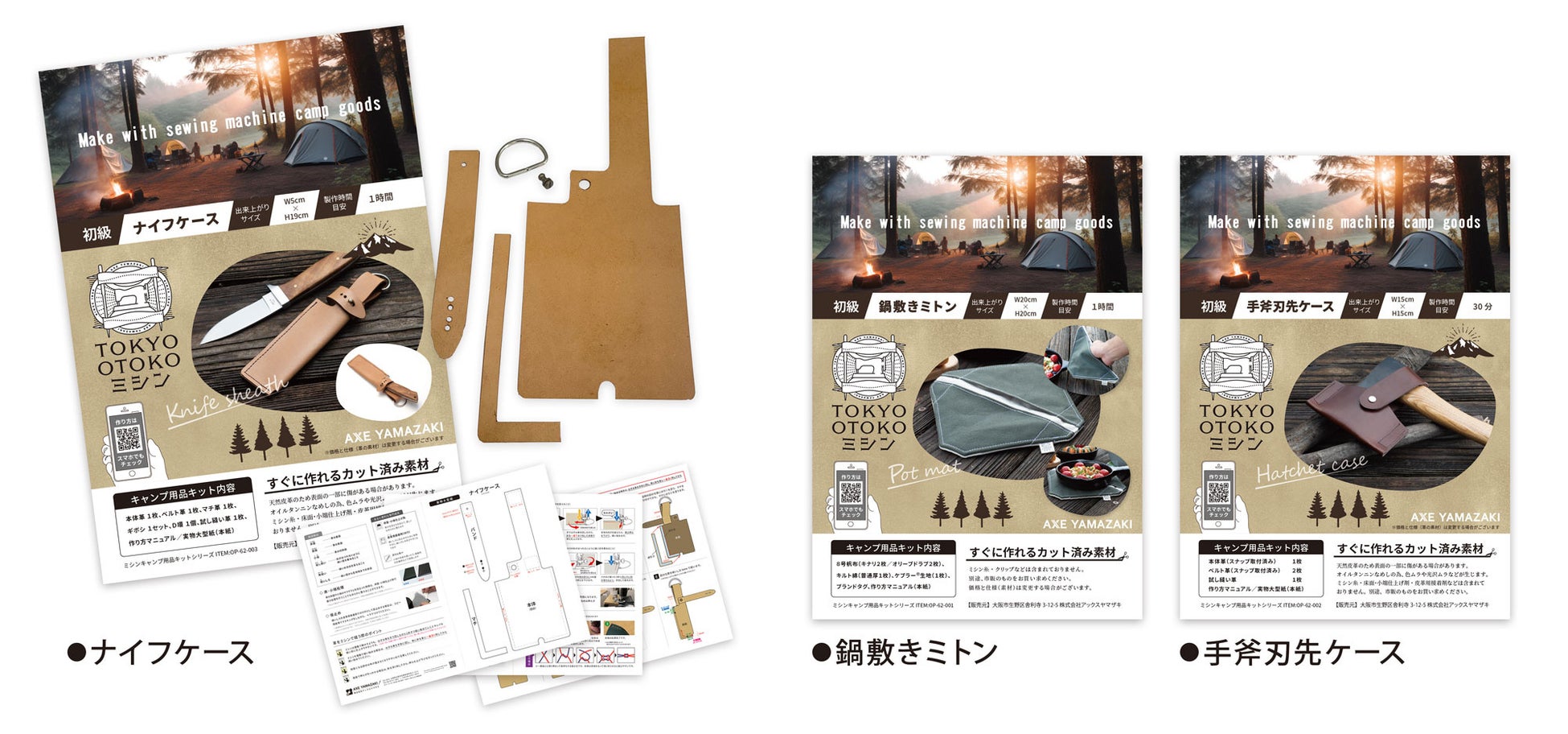 ミシンメーカー株式会社アックスヤマザキ(代表取締役:山崎 一史)は、発売から最大4か月待ちにまでなった、男の夢を叶えるミシン「TOKYO OTOKOミシン」を更に楽しんで頂くために、キャンプシーンで使うものを自分でつくれるキャンプ用キットを発売開始します。(鍋敷きミトン、ナイフケース、手斧刃先ケース)キャンプ用品を自分で作って楽しんで頂けます。※キャンプ用品キットはTOKYO OTOKOミシン専用になります。