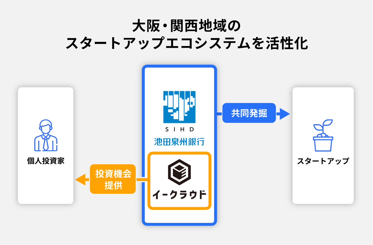 資金をはじめ様々なリソースが東京に一極集中している現状において、地方スタートアップが成長を遂げるためには新たな支援の担い手が不可欠です。このたびイークラウドと池田泉州銀行は、大阪・関西地域のスタートアップの資金調達を支援することを目的として本提携を行いました。