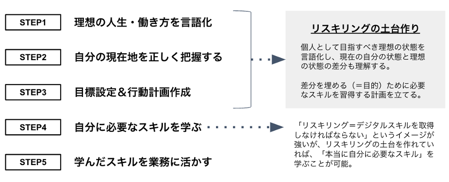 ▼弊社が考える自発的なリスキリングに必要な学習ステップ