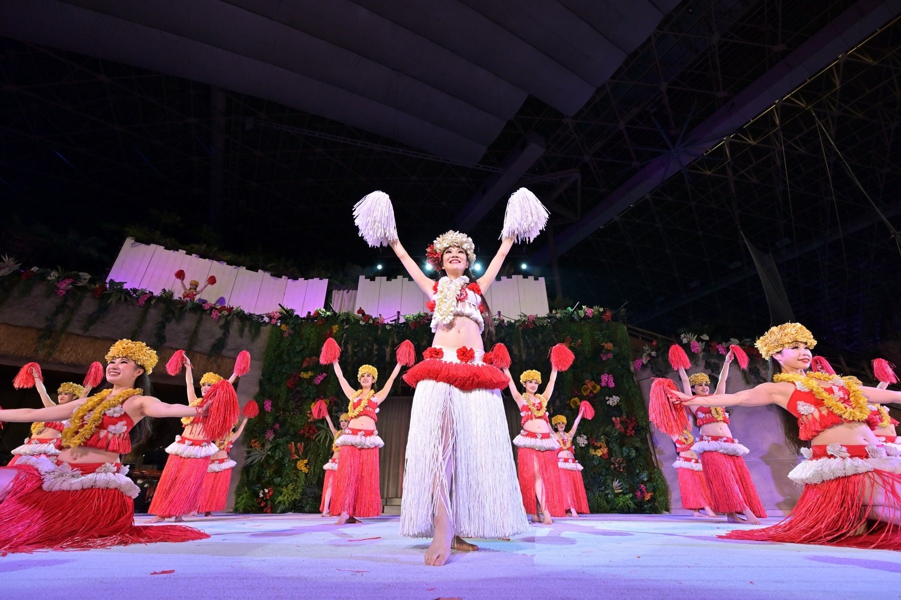 現在、公演されている夜のショー「虹~Mana’oAloha(マナオアロハ)~」は、虹の州とも呼ばれるハワイのことわざ「No Rain, No Rainbow(雨が降らなければ虹は出ない)をテーマにしたショーです。このショーは、辛いことを乗り越えることで必ず良いことが訪れるというコンセプトを持ち、心ある仲間と共に明るい未来へと繋げる思いを、虹を架け橋に表現しています。フラガール(正式名称 スパリゾートハワイアンズダンシングチーム)について