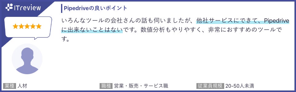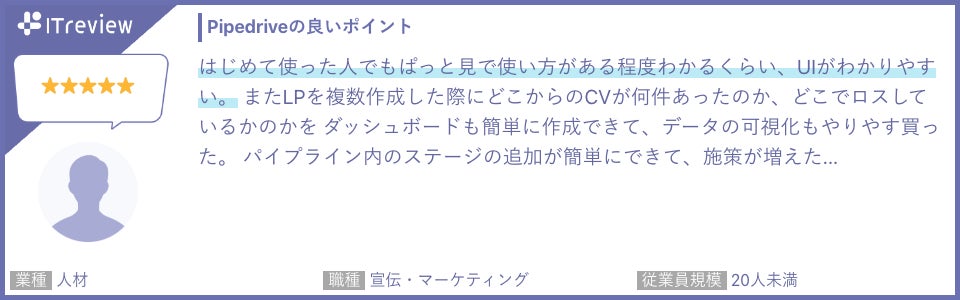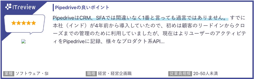 「Pipedrive」は「ITreview」で平均顧客満足度4.5を獲得しています(2024年4月18日時点)。当製品のご利用者様から実際に寄せられたレビューを一部ご紹介します。
