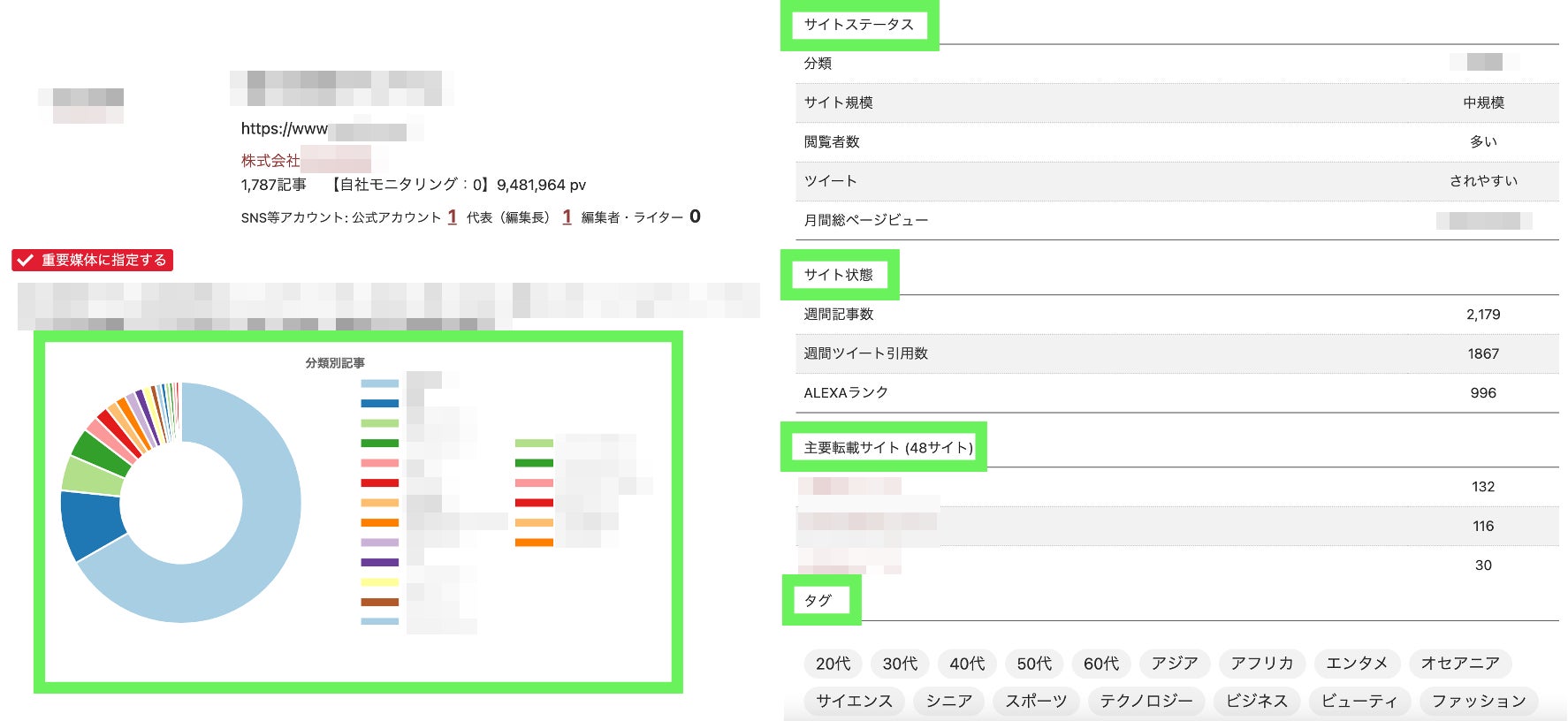 収集した記事の内、どのような内容が多く掲載されているのか、サイトの規模や月間総ページビュー、記事の主要な転載先などを分析します。