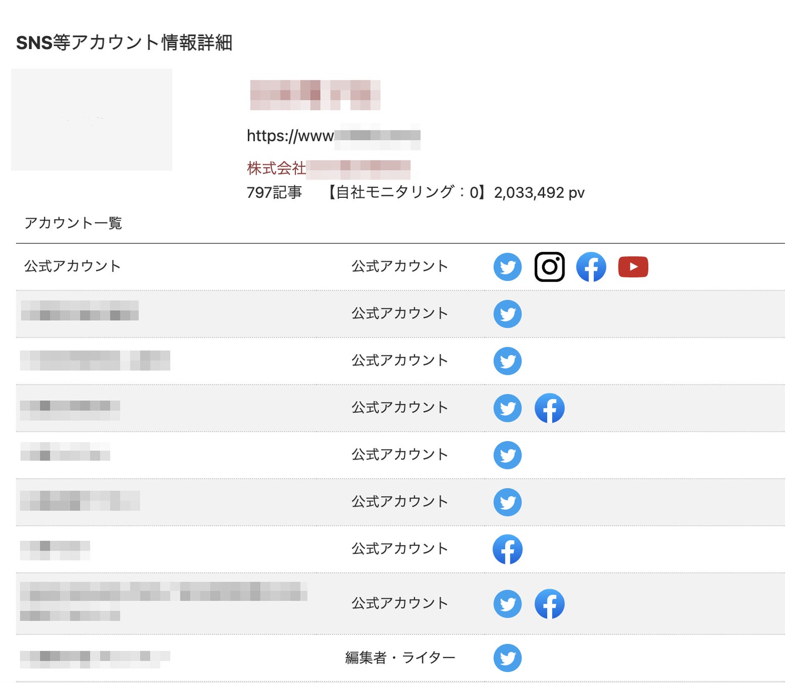 ニュースサイトがもっているTwitter、Facebook、Instagram、YouTubeのアカウントや、そのメディアの編集長・編集者・記者・ライターの名前およびSNSアカウントがわかります。