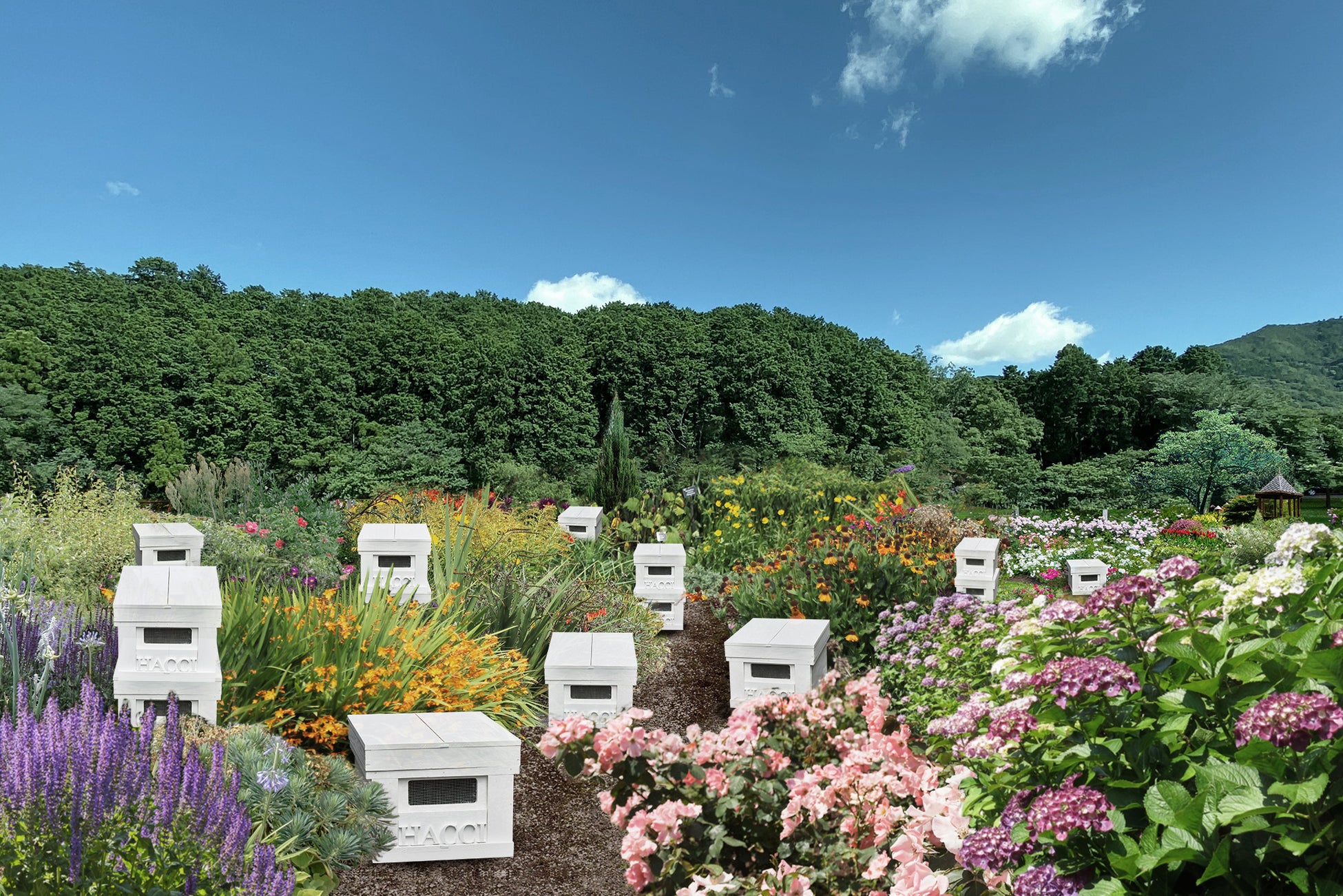 HACCI 『ミツバチの楽園』では、ミツバチにストレスをかけない、ミツバチにとって快適な環境づくりに重きを置き、水谷養蜂園の養蜂家とセレクトした四季折々咲き誇る花々を敷地内にふんだんに植栽します。また、採蜜だけではなく農作物の受粉も担い、私たちの食料を生産するのに欠かせない存在でもあるミツバチ自体の個体数を増やし、ミツバチを通じて生態系を守ることを目指していきます。さらに HACCI 『ミツバチの楽園』は、養蜂技術や活動の情報を発信する場所としても使用し、教室やセミナーをはじめ、高齢化傾向が続く養蜂家の若手育成にも取り組んでまいります。
