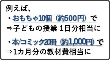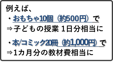 - おもちゃ10個が「子どもたちの授業1日分」に。