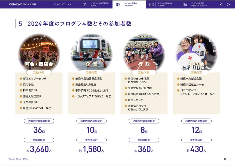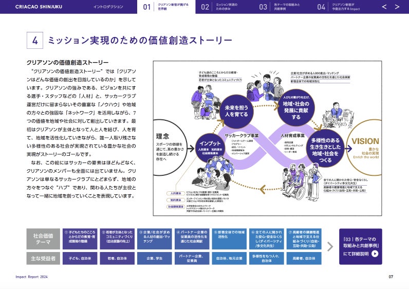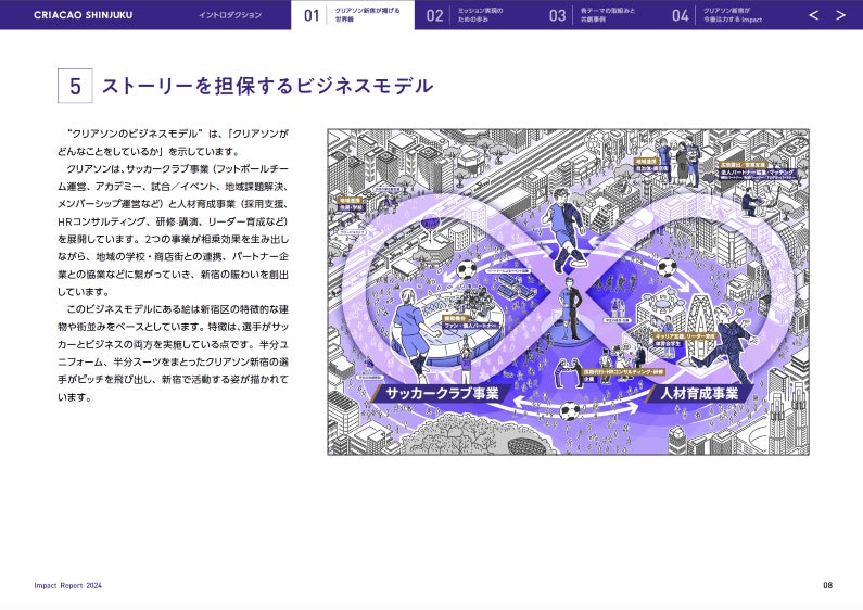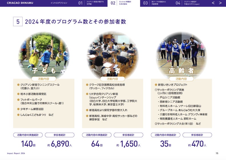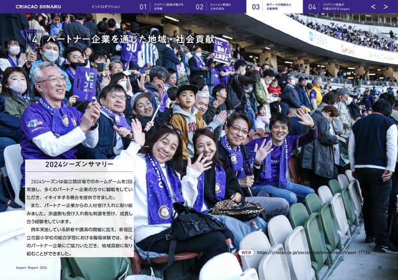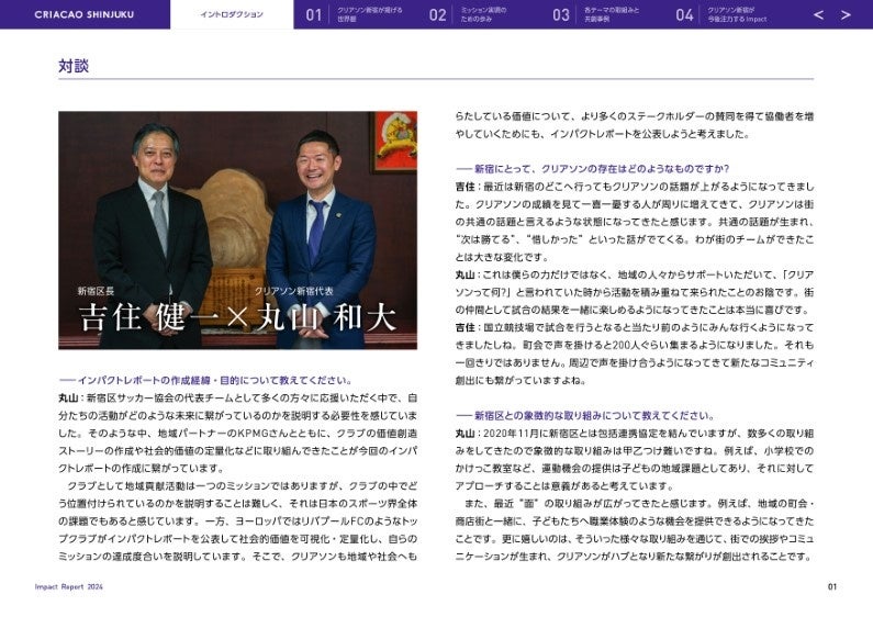 新宿区をホームタウンとするJFL(日本フットボールリーグ)所属のサッカークラブ・クリアソン新宿は、「スポーツの価値を通じて、真の豊かさを創造し続ける存在でありたい」というミッションを実現するために、新宿の社会課題解決を中心に一年間取り組んだ活動とその成果をまとめた「インパクトレポート」を初めて作成し公開しましたので、お知らせいたします。