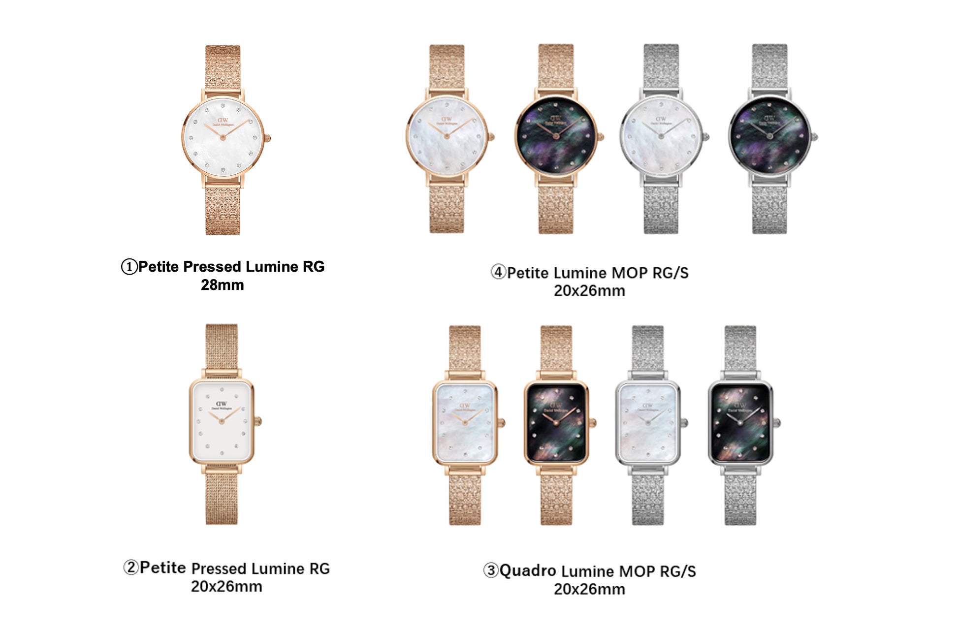 | 商品名 :Petite Pressed Lumine (ペティットプレスト ルミネ) 商品型番 : DW00100528・DW00100590~DW00100595 文字盤の色 :ホワイト マザー・オブ・パール / ブラック マザー・オブ・パール / ホワイト 文字盤のサイズ: 28mm ベルトの種類 :ローズゴールド / イエローゴールド / シルバー 価格(税込) :¥26,400~¥31,350 |
