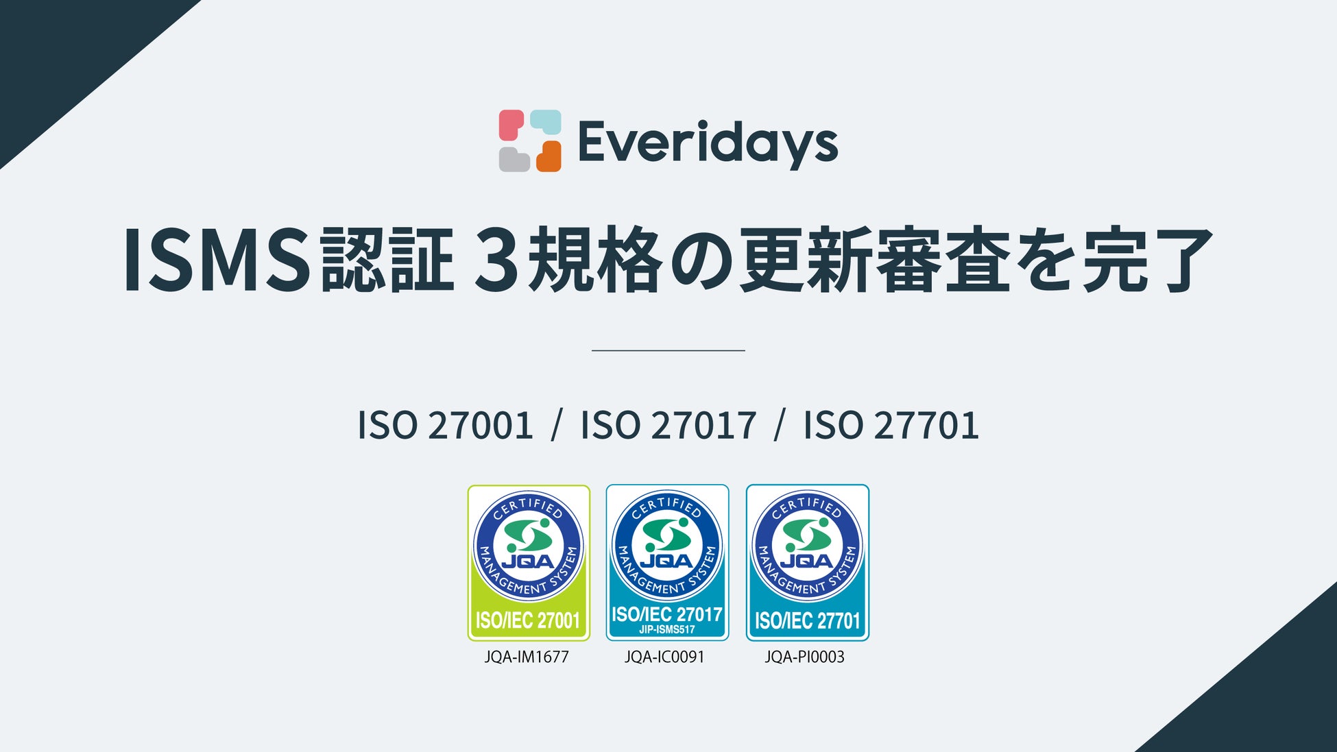 株式会社yett(本社:福岡県福岡市、代表取締役CEO:髙橋航太)は、自社が運営する法人向けクラウドストレージサービス「Everidays(エブリデイズ)」に関し、情報セキュリティに関する国際規格「ISO/IEC 27001:2022」「ISO/IEC 27017:2015」「ISO/IEC 27701:2019」の更新審査を完了したことをお知らせいたします。