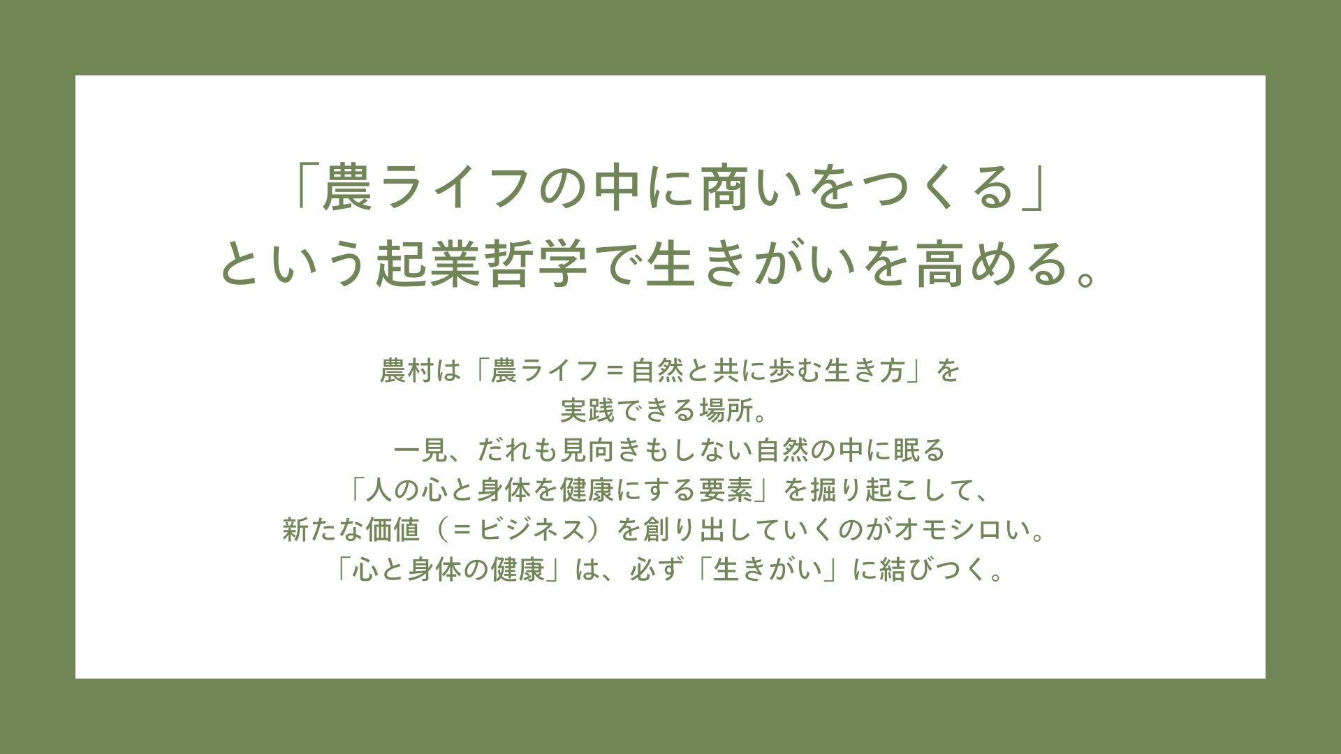 しかし、依然として「農村でのビジネス=農業」というイメージがあります。人によって理想のライフスタイルや働き方が多様な現代では、新しい農村ビジネスの在り方が必要なのではないでしょうか。