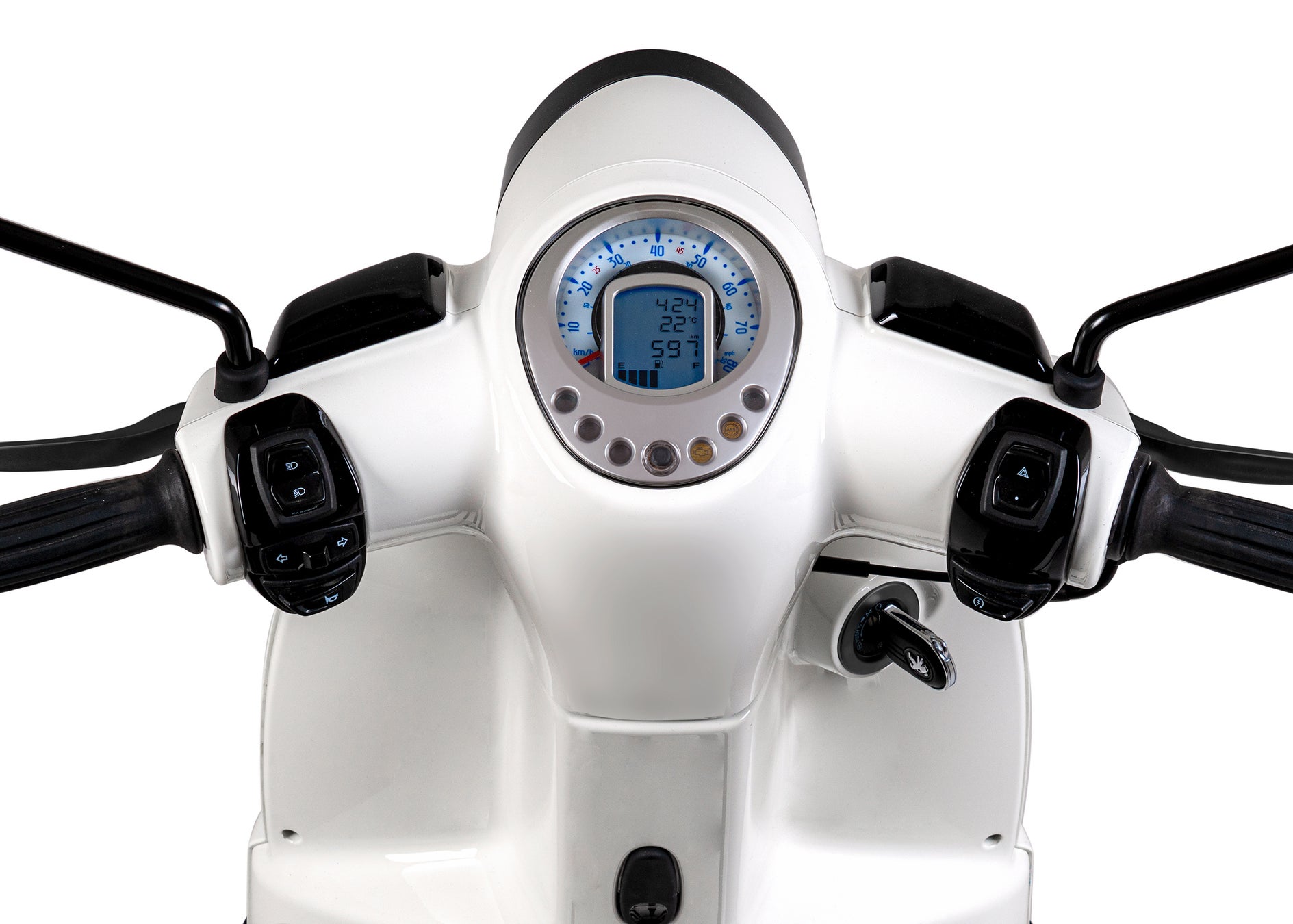 通常販売モデルとしては初めての、ホワイト単色のモデルです。ミラー、ライトバイザー、「PEUGEOT」エンブレム、「Django」エンブレム、操作系パーツ、ボディモール、タンデムグリップ、タンデムステップ、テールライトカバーなど、車体各部をブラックアウトすることでホワイトとブラックのコントラストを高め、一般的な単色モデルとは異なる個性を主張しています。