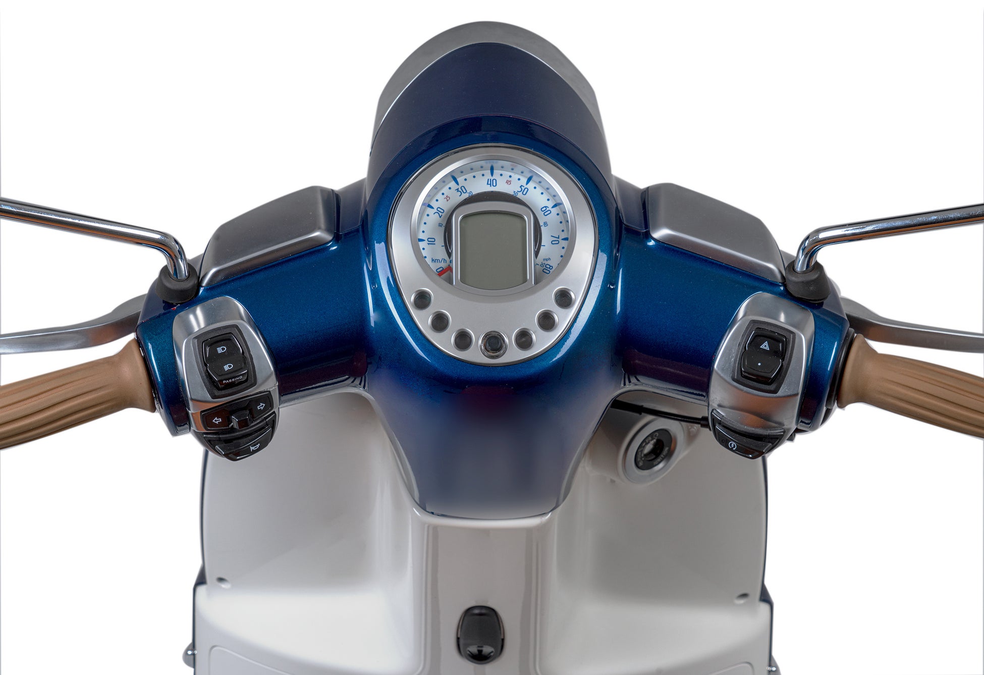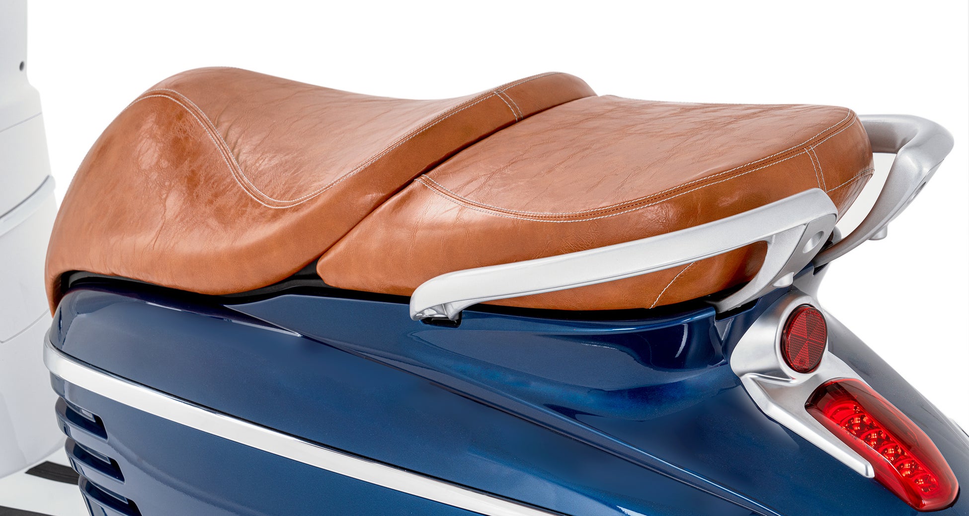 ボディカラーには、光の加減により表情を変えるメタリックブルーを採用。インナーパネル、フットボード、ホイールは上品なミルキーホワイトとし、さわやかなツートンカラーとしています。さらにハンドルグリップと前後セパレートシートはキャメルオレンジとし、クラシカルで華やかなイメージを演出します。