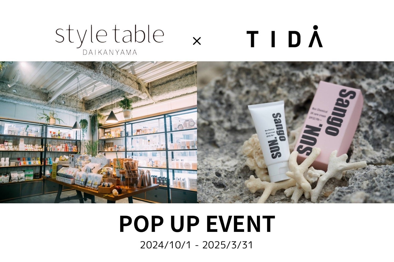株式会社フラッグ(東京都港区、代表取締役:吹上直子)が展開するセレクトショップブランド「style table(スタイルテーブル)」の「style table 代官山本店」(運営:株式会社Liberty、本社:東京都渋谷区、代表取締役:三上結香)は、自然環境に配慮した日焼け止め「Sango SUN.」を生産から販売まで行うTIDA(代表:木邨朱里)と一緒にPOP UPイベントを開催する。