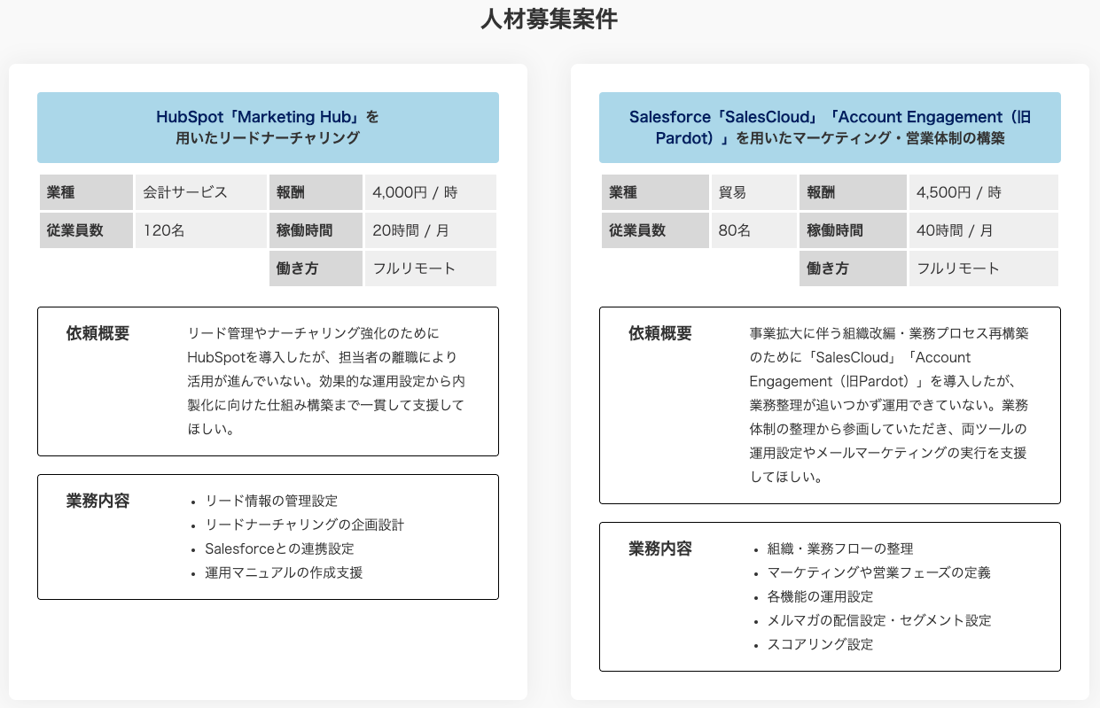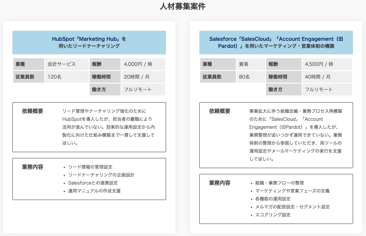 主要なMAツールやSFA、CRMをはじめ、マーケティング・営業領域のさまざまなITツールの運用経験者を募集できます。