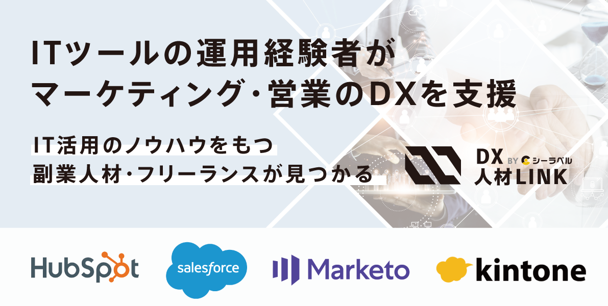 株式会社シーラベル(本社:神奈川県横浜市、代表取締役:渡辺敬吾)は、営業・マーケティング系ITツールの運用人材と企業をつなぐマッチングサービス「DX人材Link」を2022年12月7日(水)にリリースいたしました。企業は、自社で活用したいITツールの運用経験・ノウハウをもつ副業人材やフリーランスに業務を委託し、DXを推進することができます。