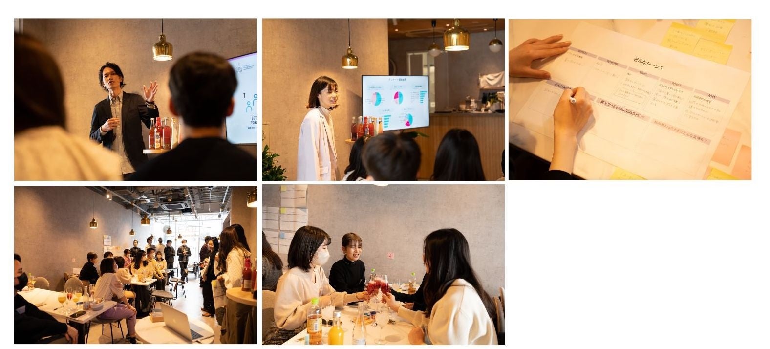第1回のワークショップを3月4日にスマドリバー渋谷で開催し、7月に発売する商品のアイデア出しを実施しました。具体的な飲用シーンとして「テラス席のバルで友人にバースデーサプライズ」「夏夜のバルコニー」「花火大会でダブルデート」などのアイデアが生まれました。4月1日にスマドリバー渋谷で試作品の試飲会を実施します。