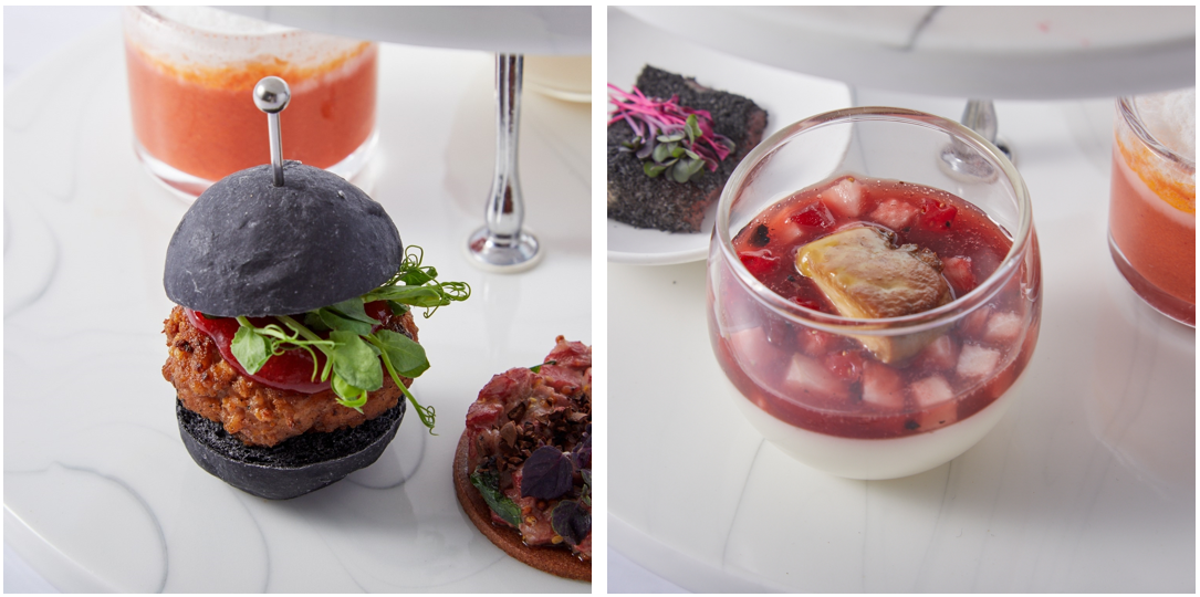 鴨肉ミニバーガー / 根セロリのフラン / オマール海老のビスク / 漬けカツオ 燻製炭の薫り / 和牛のタルタルとカカオ
