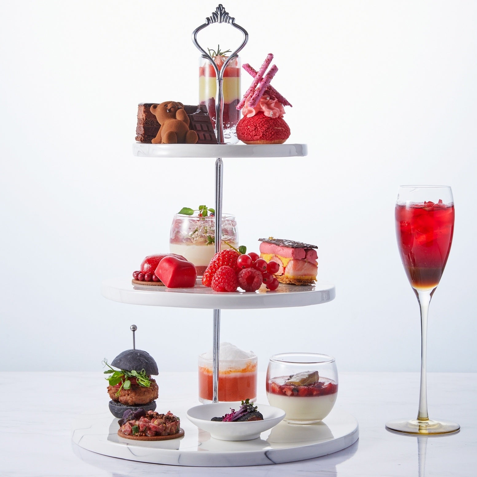 バレンタインをイメージした「クランベリーショコラ」のウェルカムドリンクは、甘酸っぱくすっきりとした大人の味わいをお楽しみいただけます。上段・中段には真っ赤なハートの「苺とチョコレートムース」「ボンボンショコラ」や、「苺のミルフィーユ」等、華やかで可愛らしいスイーツをラインナップ。下段には、定番の「鴨肉のミニバーガー」や「オマール海老のビスク」に加え、バレンタイン限定の「和牛のタルタルとカカオ」等、こだわりのセイボリーが並びます。2023年のバレンタインは、LOUANGE TOKYO Le Muséeのアフタヌーンティーとともに、大切な方と心温まるひとときをお過ごしください。