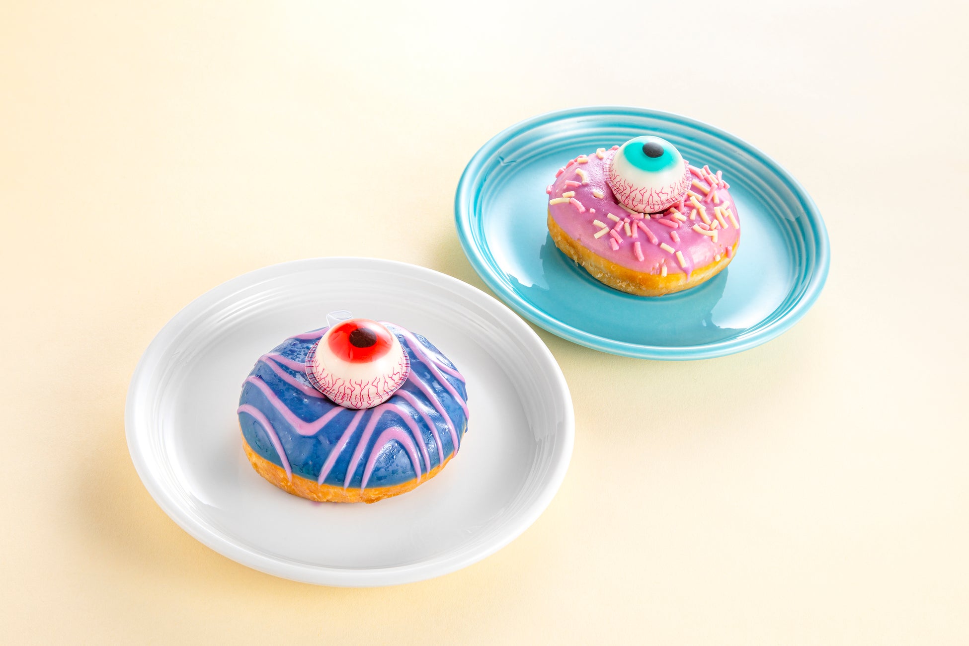 デザートもご一緒に!パンプキンプディングは、かぼちゃの甘さと風味を活かしつつ、少しビターな大人の味が楽しめるプディングに仕上げました。ぎょろりと目玉がついたドーナツは、しっとり滑らかな食感で大人も子ども楽しめます。ドーナツストロベリードリームと、フォレストベリーの2種をご用意。