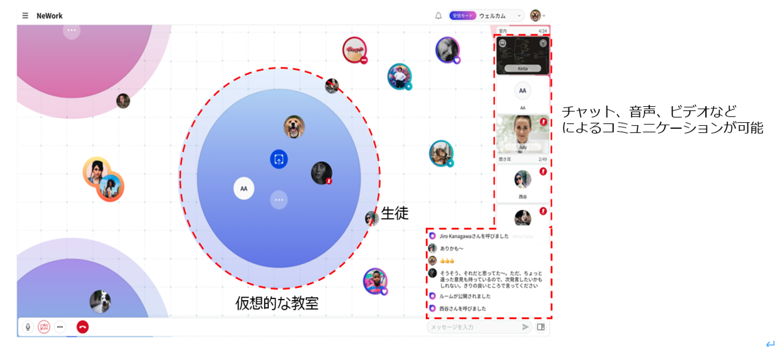 「バーチャル教室」とは、「フレンドリーオンライン」に参加する児童生徒がオンライン上で自由にコミュニケーション可能な空間です。集団生活への慣れやコミュニケーションに対する児童生徒の不安軽減を目的としています。「バーチャル教室」は、NTT Comが提供するオンラインワークスペース「NeWork®」を活用し実現しており、円状の仮想的な教室に入室した児童生徒間でチャット、音声、ビデオなどによるコミュニケーションが可能です。