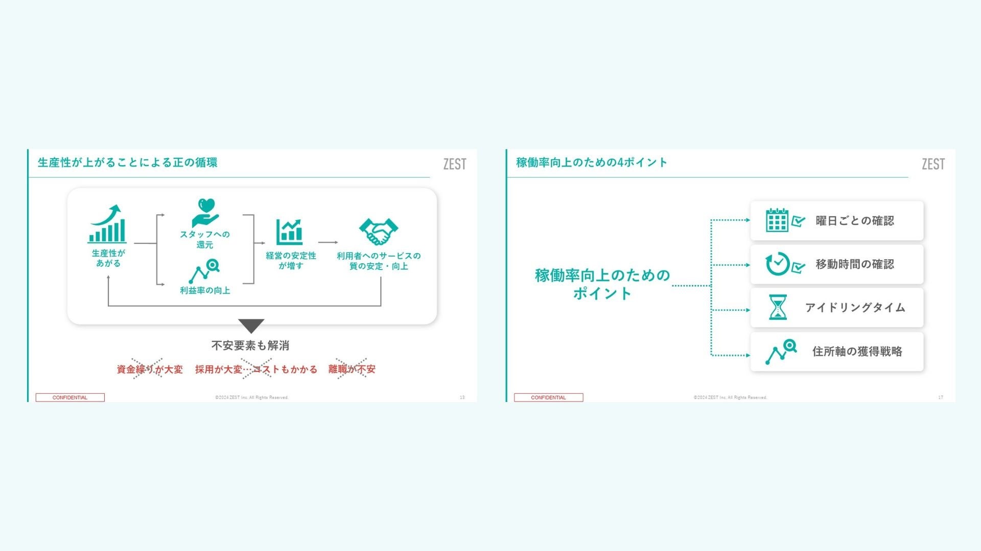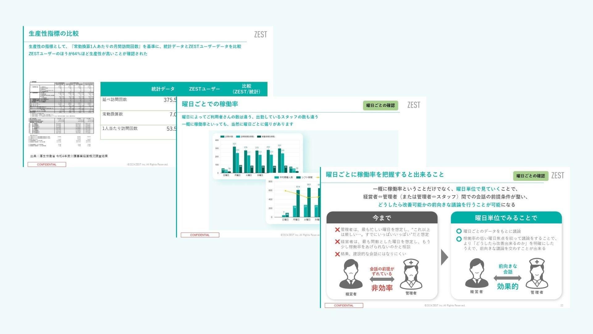 本ホワイトペーパーでは、人材不足が顕著な訪問看護ステーションにおける一人ひとりの生産性向上の重要さを『ZEST』のユーザーデータをもとに証明し、生産性向上による売上向上までのシミュレーションを行いました。また、生産性の指標となる「稼働率」を上げるためのポイントを具体的に提案することで、訪問看護ステーション経営における新たな視点を提供し、明日から使える実践的な手法を紹介した内容になっております。