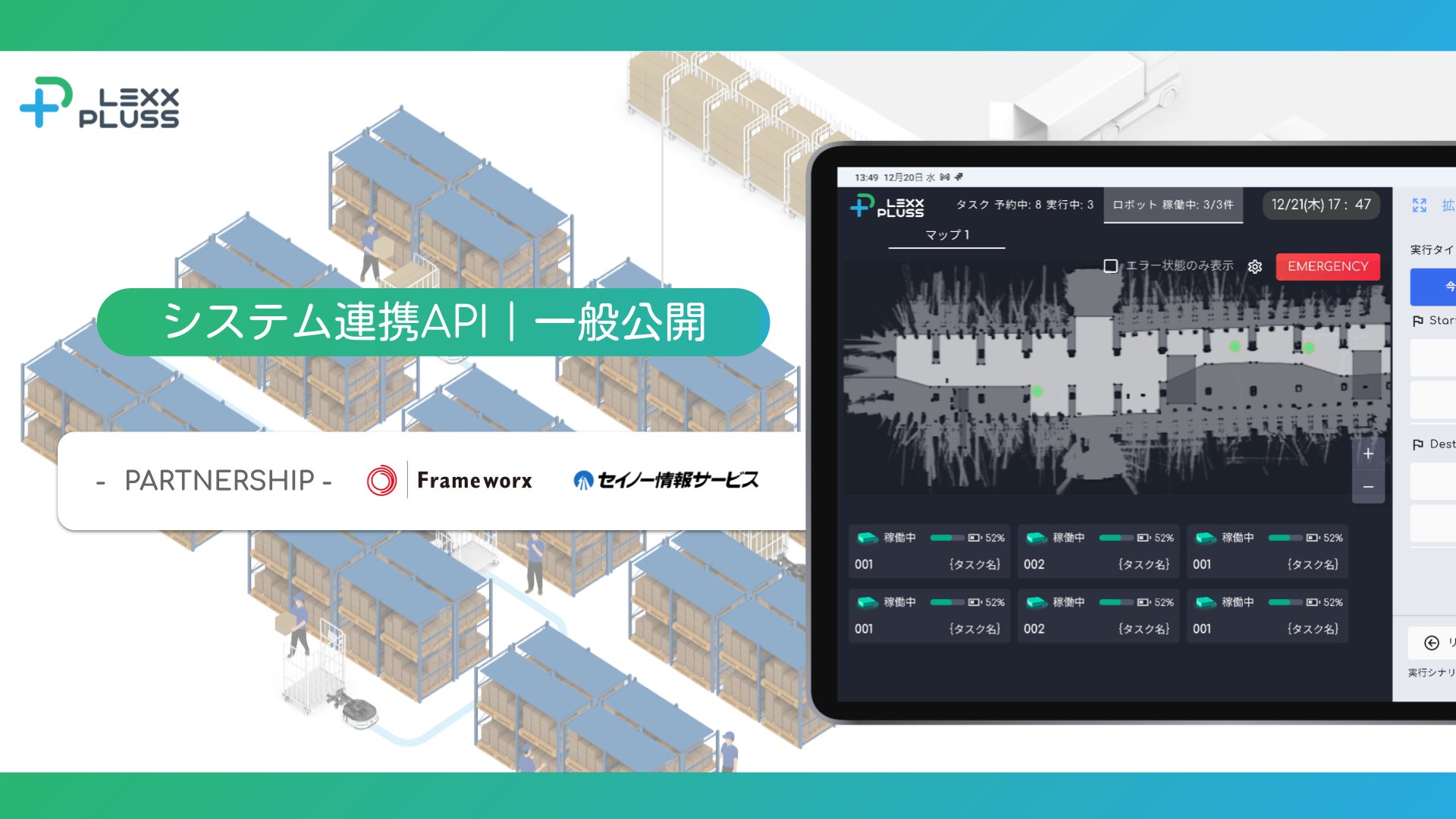 次世代の自動搬送システムを開発する株式会社LexxPluss(神奈川県川崎市、代表取締役:阿蘓 将也、以下LexxPluss)は、卸売、チェーンストア向けの物流センターの倉庫管理システム(WMS)や製造工場の生産管理システム(MES)と連携が可能なシステム連携APIを一般公開します。また、WCS/WESを手掛ける、大和ハウスグループの株式会社フレームワークス、セイノーホールディングスの子会社である株式会社セイノー情報サービス、その他1社とのシステム連携開発をはじめます。