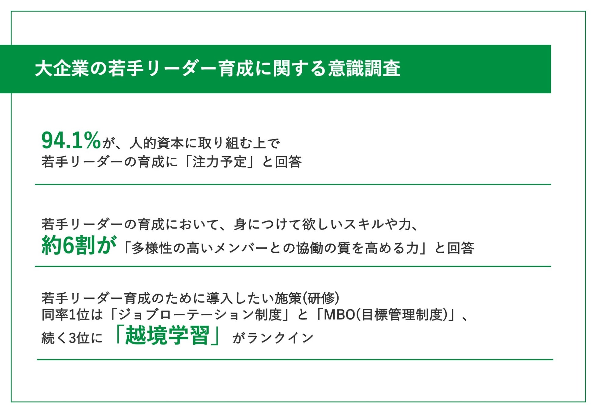 今回の調査では、大企業における人的資本経営の中核として、若手リーダーの育成が非常に重要視されていることが明らかになりました。変化が激しい現代社会においては、多様性を受け入れ、新たな価値を創出できるリーダーの存在が不可欠です。越境学習を通じて若手リーダーに新たな視点や高い視座をもたらし、社内外の多様な環境での協働や自己成長を促進することは、企業の未来を担う人材の潜在能力を引き出し、イノベーションを促す重要なステップとなるのではのではないでしょうか。