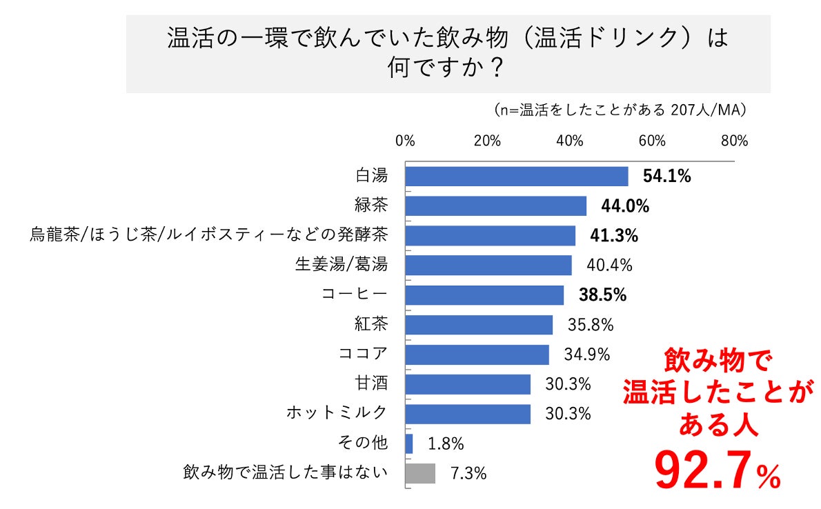 •「温かい食べ物・飲み物を摂取する」と回答した方で「飲み物」を主流としていた方は92.7%。