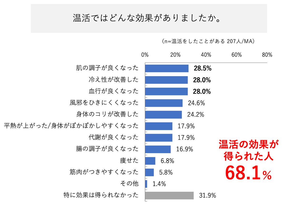 •温活をしたことがある人のうち温活の効果を得られた人は68.1%にのぼった。効果については、「肌の調子が良くなった」28.5%、「冷え性が改善した」28.0%「血行が良くなった」 28.0%と回答。そのほか「風邪をひきにくくなった」 24.6%や「身体のコリが改善した」 24.2%が上位にランクイン。特に50代は最も温活の効果を実感しており、その割合は76.9%に上った。