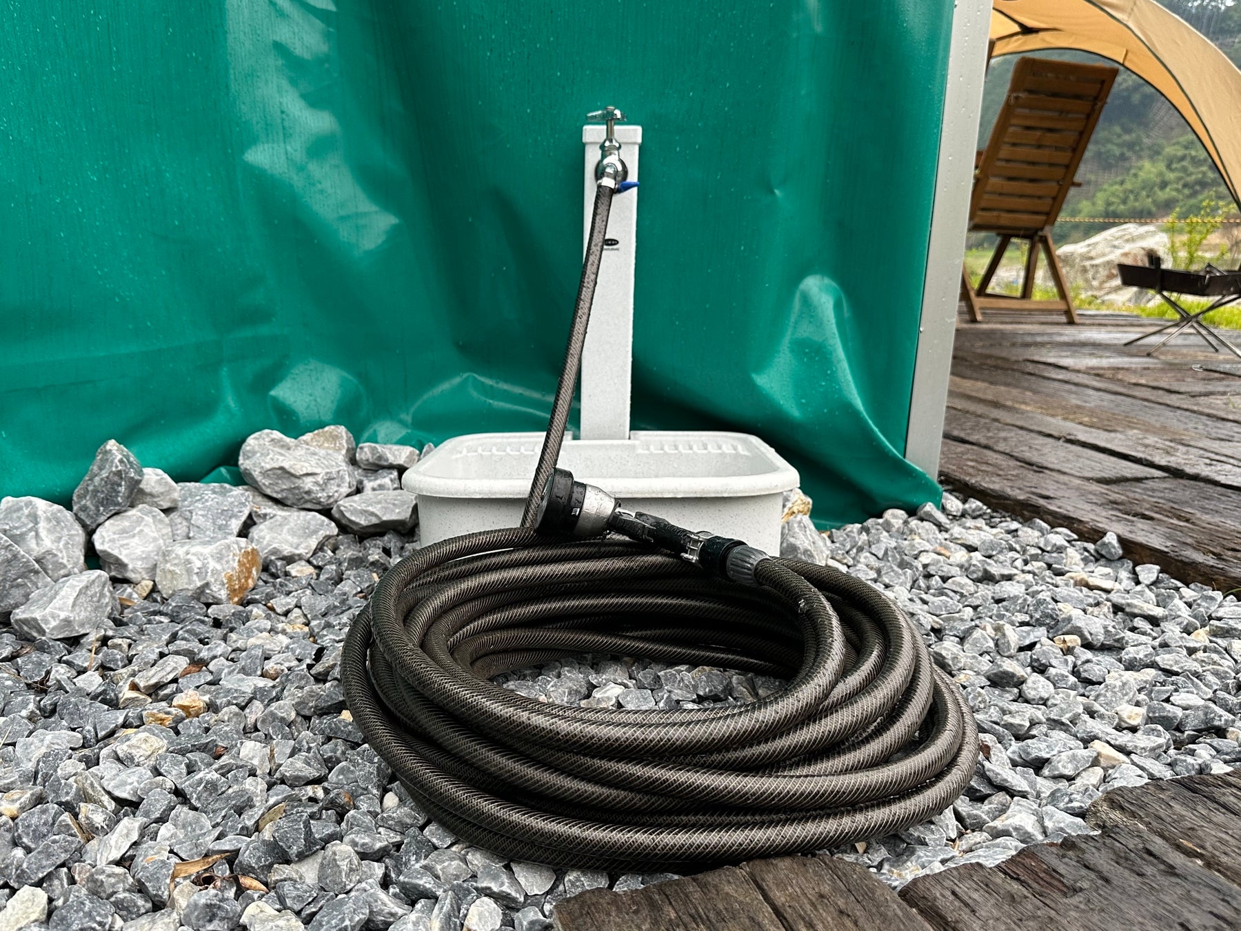 川遊びや芝生を駆け回った後は、足洗い場で汚れを落としていただけます。じっとするのが苦手な元気いっぱいのご家族でも、長いホース式なのでご安心ください。