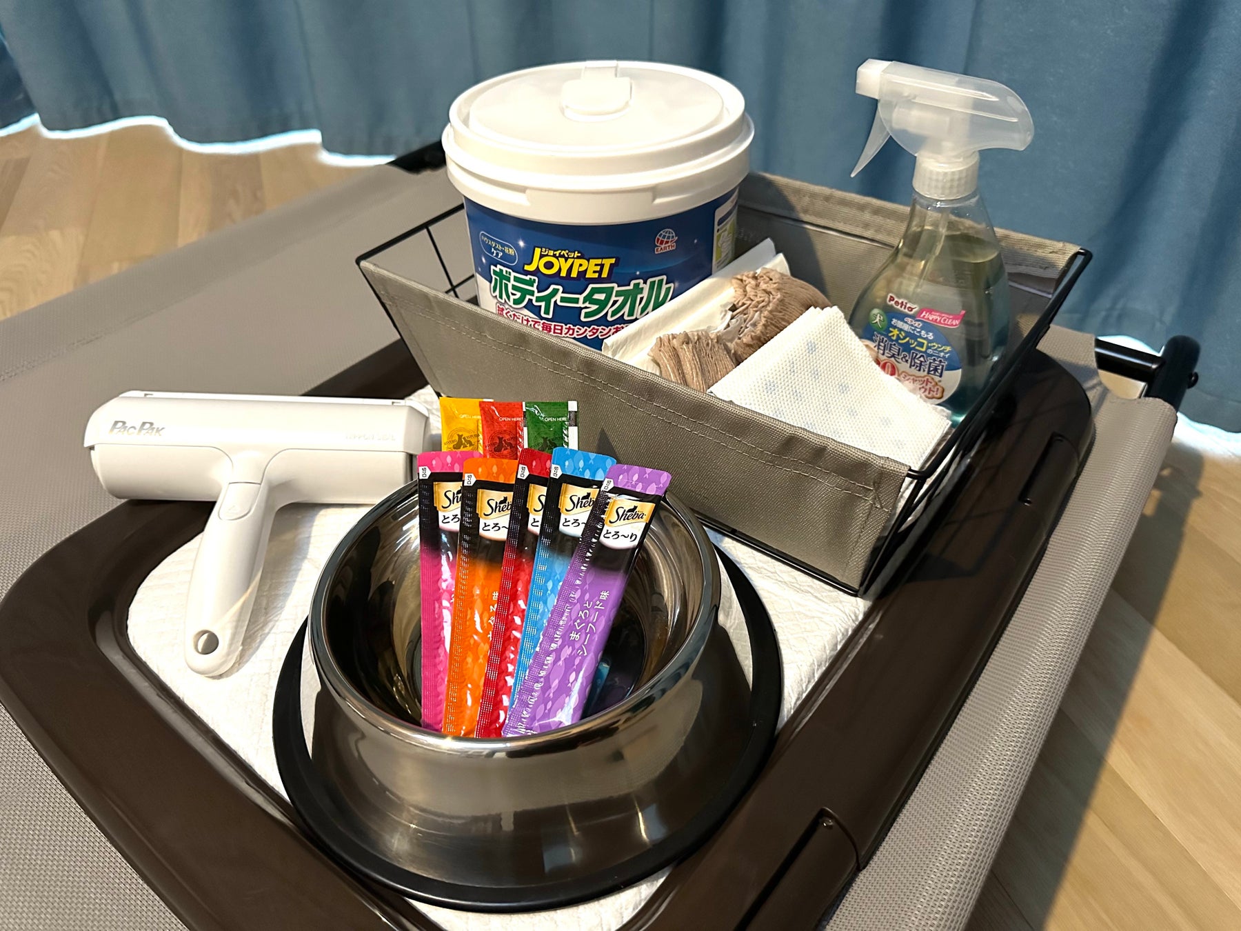 室内にはペット用ベッド、餌入れ、トイレトレー、ローラーブラシが備え付け。別途有料でアメニティのご注文も可能です。手ぶらで安心してお越しくださいませ。