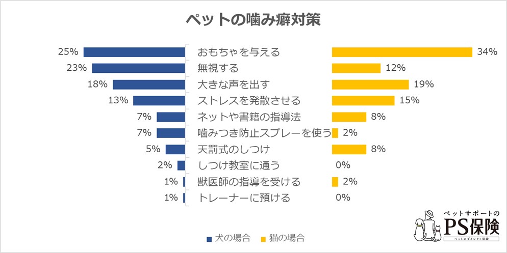犬猫共に「おもちゃを与える(犬:25%、猫:34%)」が最も多い結果なりました。2位以降についてはそれぞれ順位が異なりますが、「無視する(犬:23%、猫:12%)」「大きな声を出す(犬:18%、猫:19%)」「ストレスを発散させる(犬:13%、猫:15%)」が続き、1位の「おもちゃを与える」を合わせて全体の約8割を占めます。