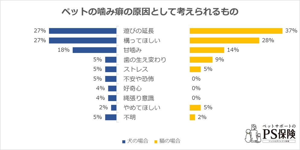ペットの噛み癖の原因として、犬も猫も「遊びの延長(犬:27%、猫:37%)」「構ってほしい(犬:27%、猫:28%)」「甘噛み(犬:18%、猫:14%)」が上位3位を占めました。
