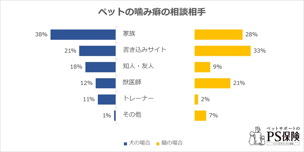 ペットの噛み癖の相談相手として、犬を飼っている回答者の場合は、「家族(38%)」が最も多く、猫の場合は、インターネットの「書き込みサイト(33%)」が最も多いという結果になりました。続いて、犬を飼っている回答者は、「書き込みサイト(21%)」「知人・友人(18%)」となりますが、猫の場合は「家族(28%)」「獣医師(21%)」と続き、明らかな違いが見て取れます。