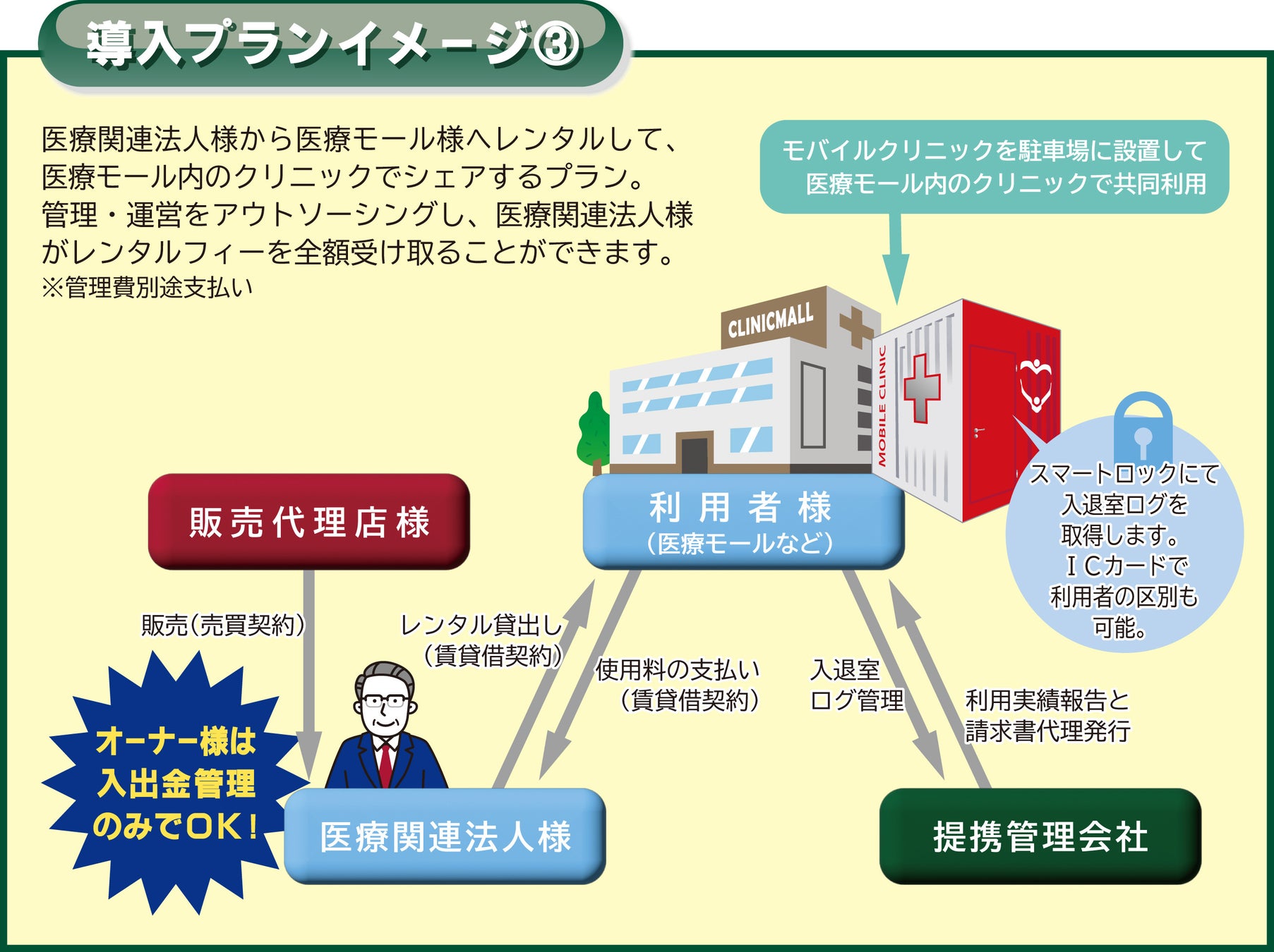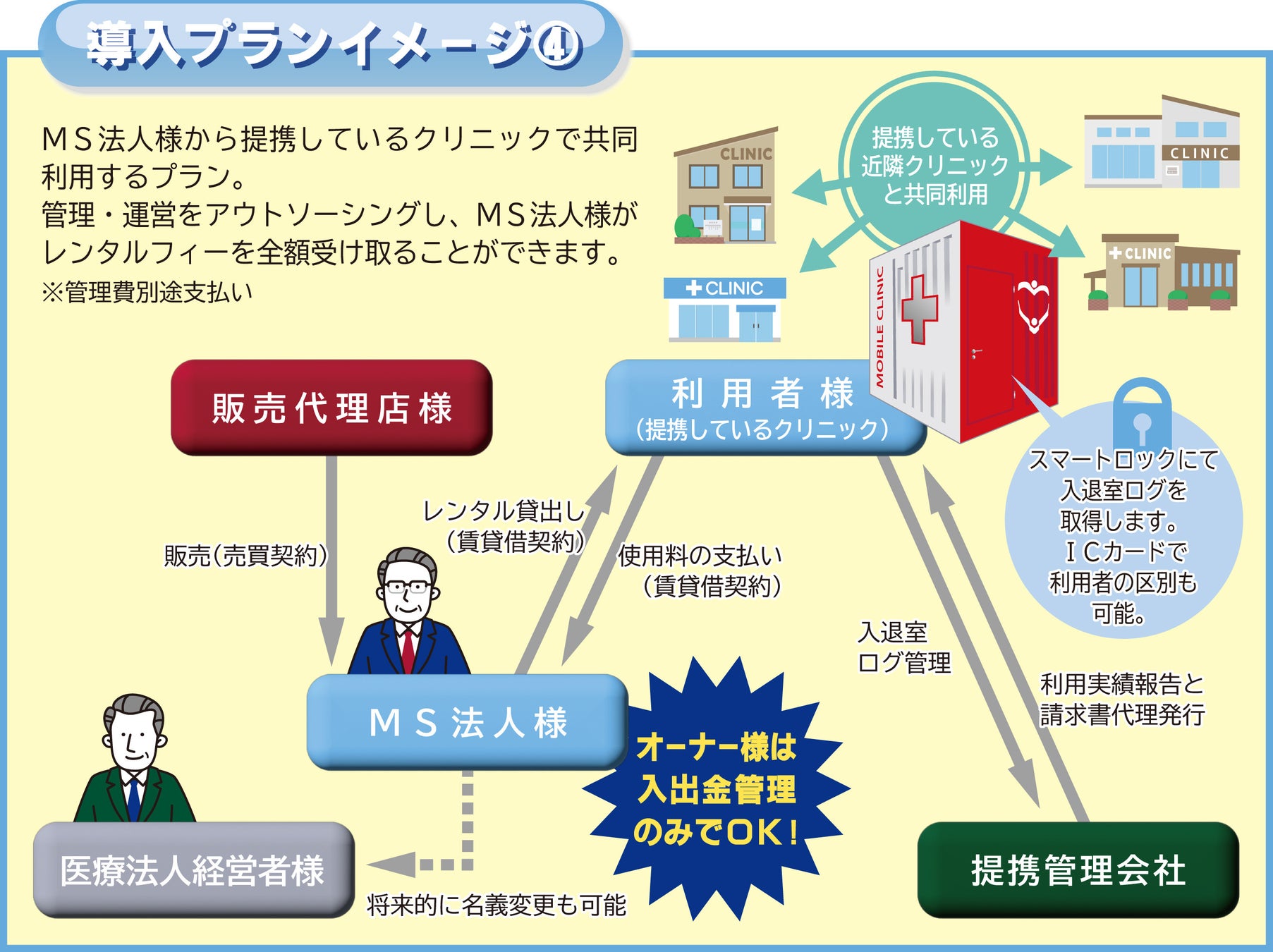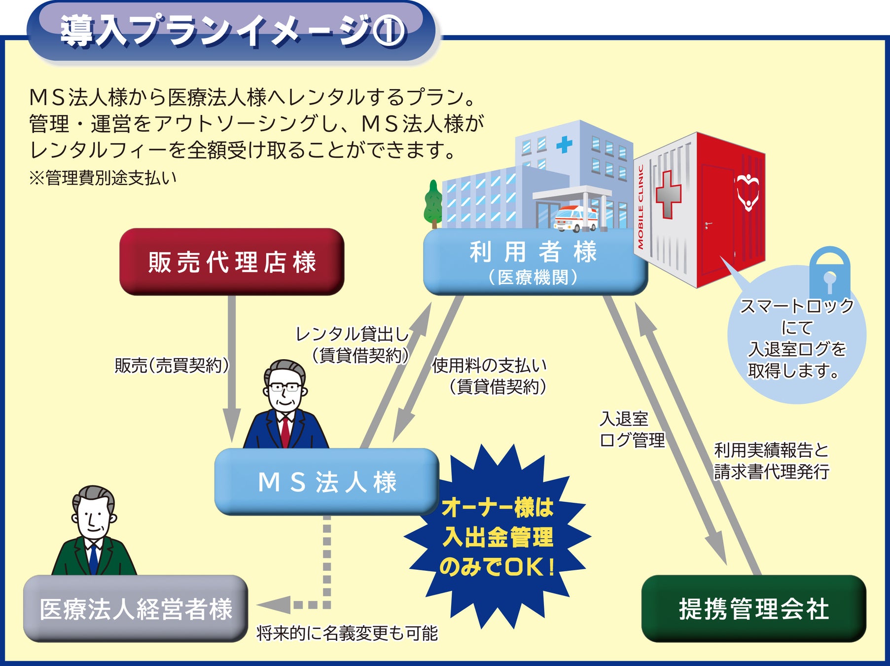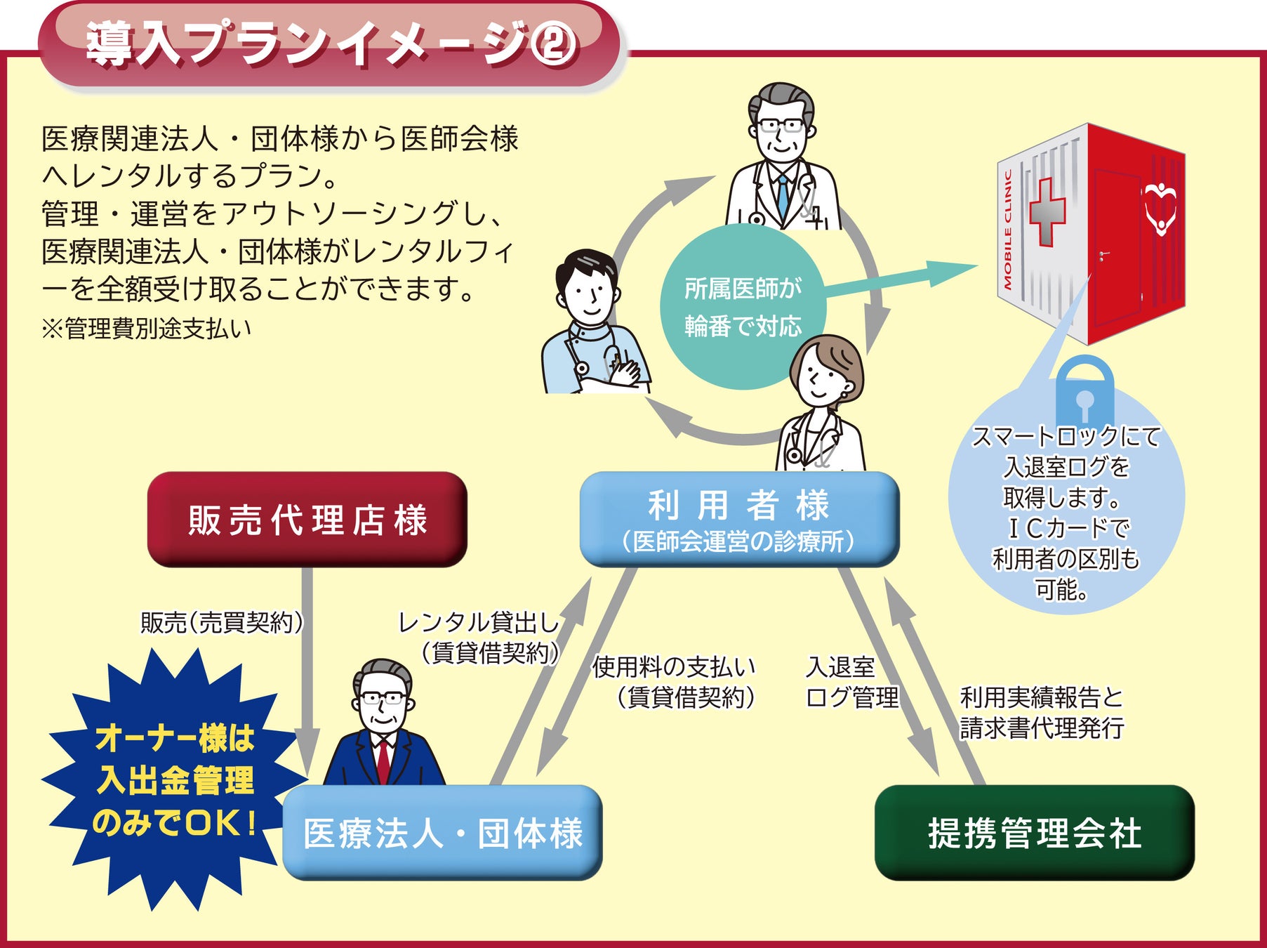 また、モバイルクリニック™の管理・運営を外部委託しレンタル料を受け取ることによって、将来的に病院経営者様本人に収益を還元することもできる仕組みになっています。