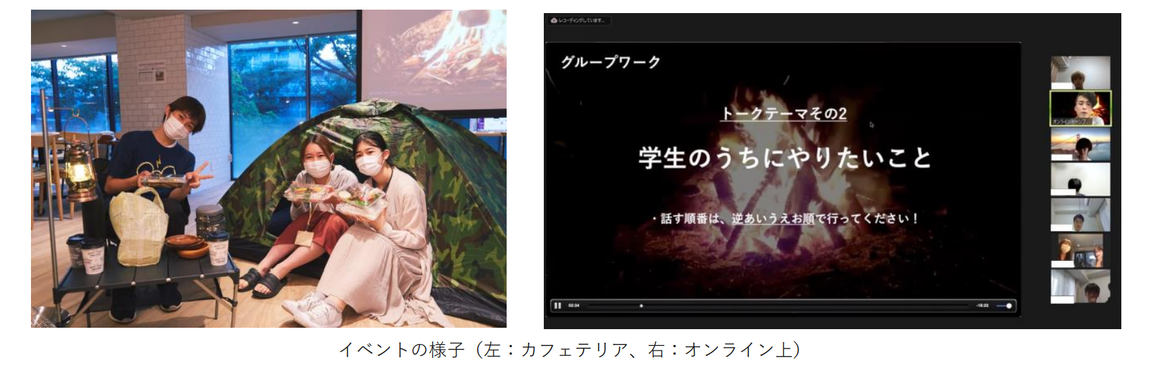 「手ぶらでキャンプ体験」は、「CAMPUS VILLAGE(キャンパスヴィレッジ)」に入居する学生が各部屋から、オンライン上で、プロ講師からキャンプやバーベキューなどアウトドアの“遊び”や楽しみ方を学び、焚火 を“囲み”ながら、“学び”をとおして、参加者同士の交流を深めることができます。その後、「CAMPUS VILLAGE (キャンパスヴィレッジ)」内のカフェテリアにてお弁当を提供し、まるで焚火で料理をしたかのような“キャ ンプ飯”を楽しむことができ、オンラインとオフラインを掛け合わせることで人間関係を構築する、ハイブリッド型のイベントになります。