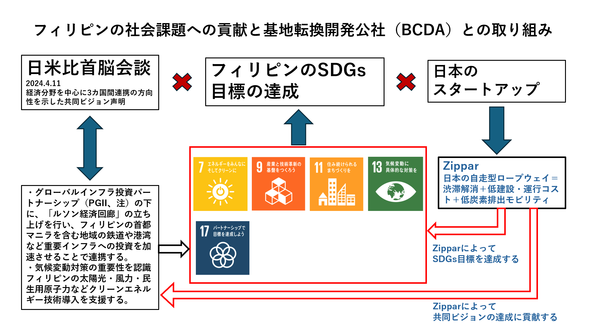 また日本の岸田文雄首相、米国のジョー・バイデン大統領、フィリピンのフェルディナンド・マルコス大統領は今年の4月11日、米国首都ワシントンで、日米比3カ国首脳会談を実施し、経済分野を中心に3カ国間連携の方向性を示した共同ビジョン声明を発表されました。共同声明で示された幾つかの具体的な連携分野および方向性の中で、「グローバルインフラ投資パートナーシップの下に、『ルソン経済回廊』の立ち上げを行い、フィリピンの首都マニラを含む地域の鉄道や港湾など重要インフラへの投資を加速させることで連携する。」及び「気候変動対策の重要性を認識し、フィリピンの太陽光・風力・民生用原子力などクリーンエネルギー技術導入を支援する。」ことが言及されております。この2つの分野においては新たな交通システムである「Zippar」が貢献できるものと期待されます。