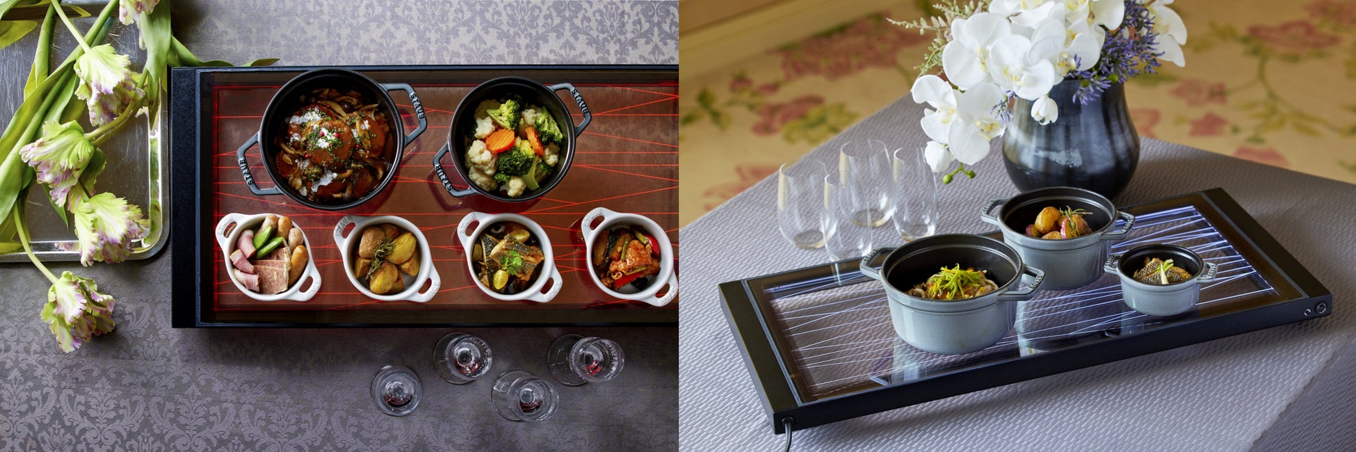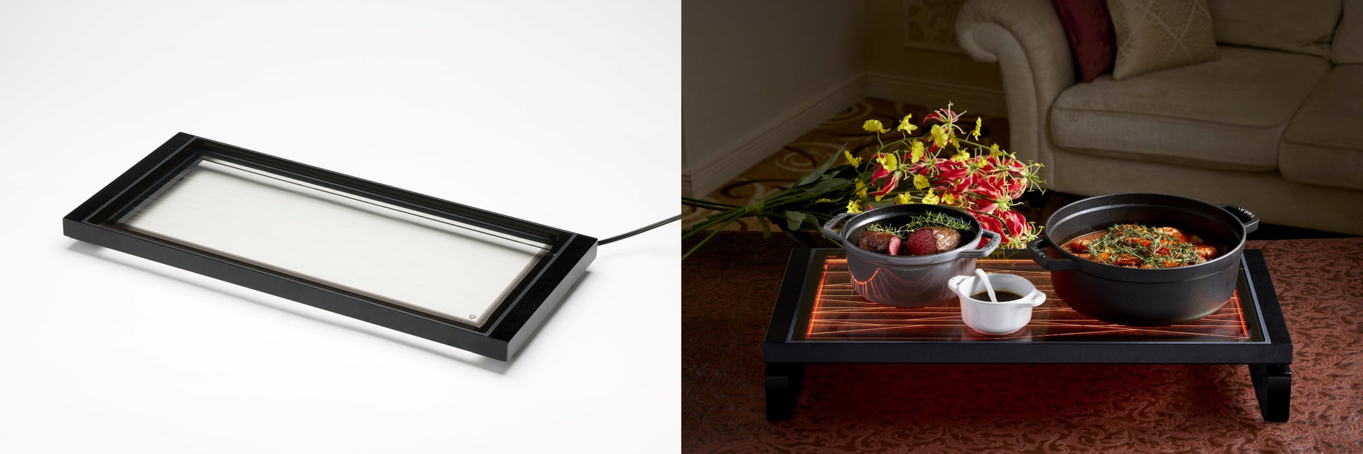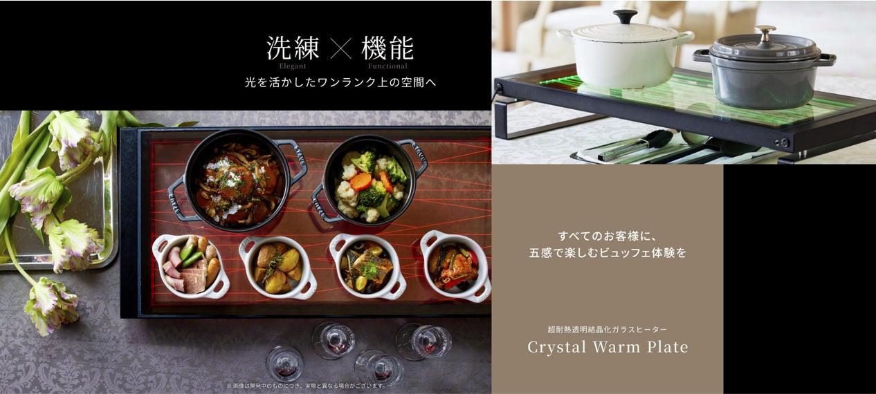 高い強度と耐熱性を備えたヒーターガラスと、特殊な光拡散印刷を施したガラスを組み合わせた構造となっています。ガラスの透明感を活かした新たな空間の演出が可能になるとともに、ガラスヒーター全面が発熱することで従来品よりもムラの無い保温性能を実現しております。先行して一部のホテル様には実際に試用いただきご好評をいただいております。