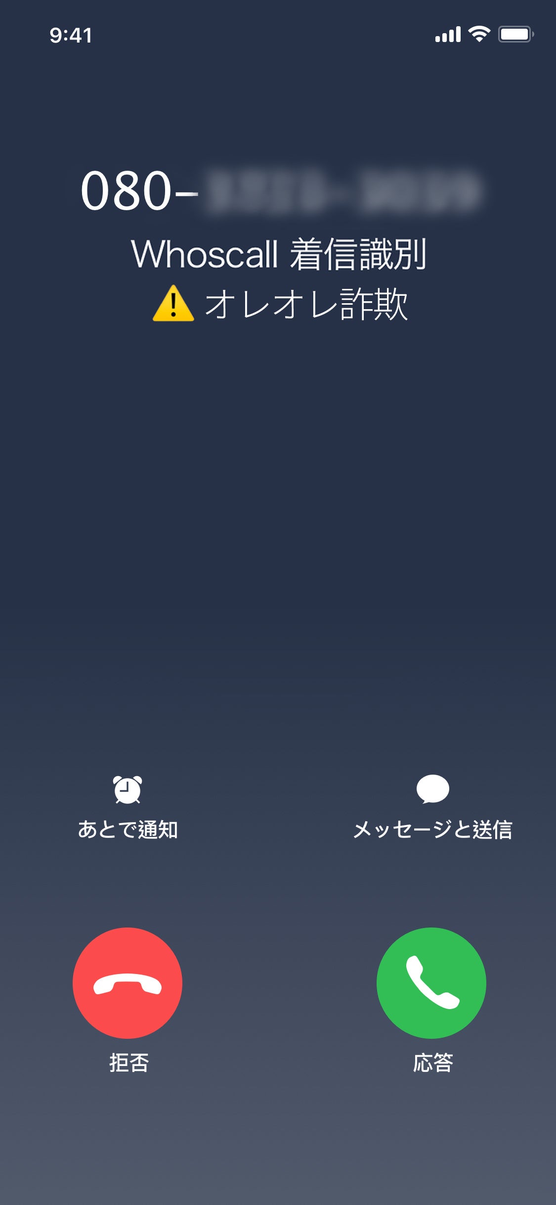 Whoscallをインストールしている場合、詐欺で使用されている不審な番号からの着信はその旨が表示され、電話に出ずにすみます。また、行政からの着信など電話に出る必要がある場合、連絡先を登録していなくとも、発信元が表示されるため電話に出そびれることも防げます。